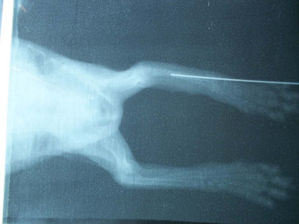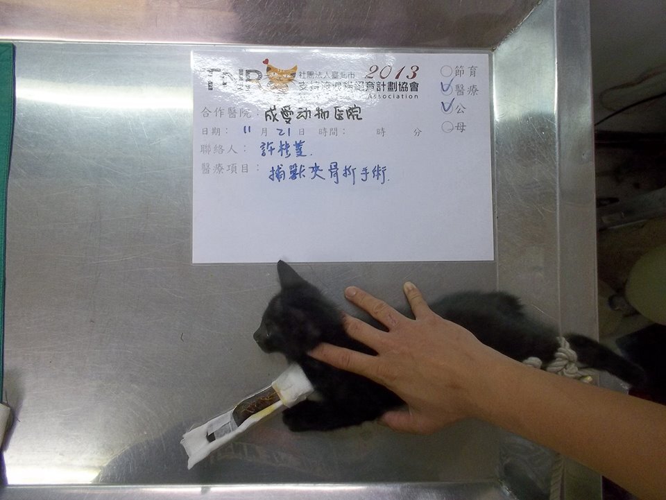 主題: 右前腳被捕獸夾夾斷之小黑貓 申請者姓名: 許桂菱 花色: 申請日期: 2013-12-11 00:29:38 申請者部落格: 申請者臉書網址: 所在縣市/合作醫院: 彰化縣/成愛動物醫院 治療費用: 6200元 需求人數: 8人 已結案 (2014-01-10 17:49:01) 報名人員: tiffany、劉定惠、Justin Wang(已付款)、Tiffany Shen(已付款)、小月(已付款)、shirina(已付款)、徐芳芳(已付款)、Chen-Pang Chang、Captainken Lai(已付款)、詩詩(已付款)、潼潼(已付款)、 候補人員: 牛豬魚、 動物病情說明: 鹿港貓友於下班時聽到小貓哀叫聲,尋找叫聲發現其公司後門旁的私人雜物間有隻小黑貓被捕獸夾夾傷,故緊急向志工求救,志工無法立即趕至現場,請貓友先抓至合作之動物醫院緊急處理,經照X光後右前腳夾扁,醫生施作打釘接連固定,因傷了神經前腳掌沒有反應且無法正翻,小貓目前也只有兩個月大,需持續觀察未來是否需要截肢!