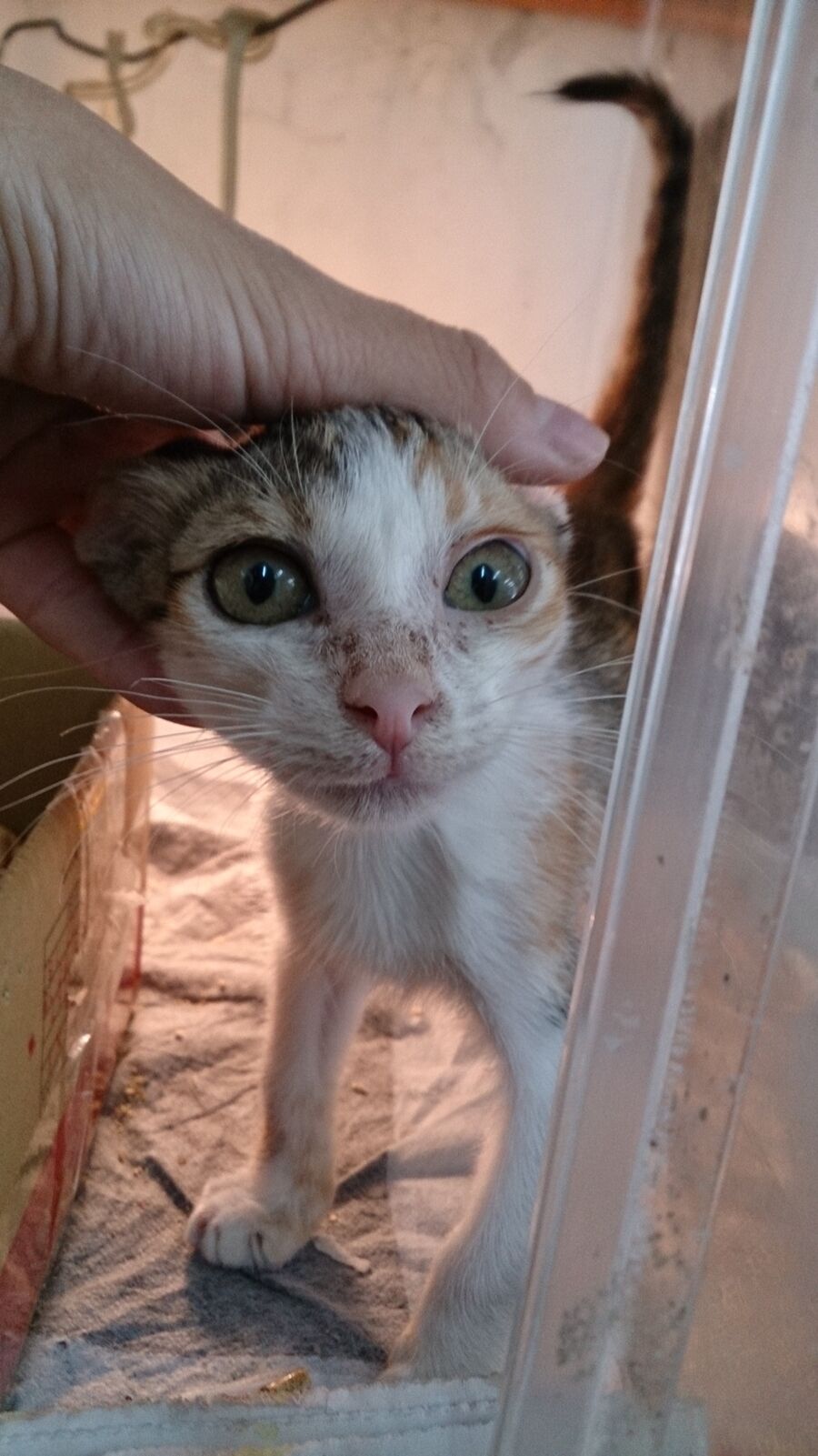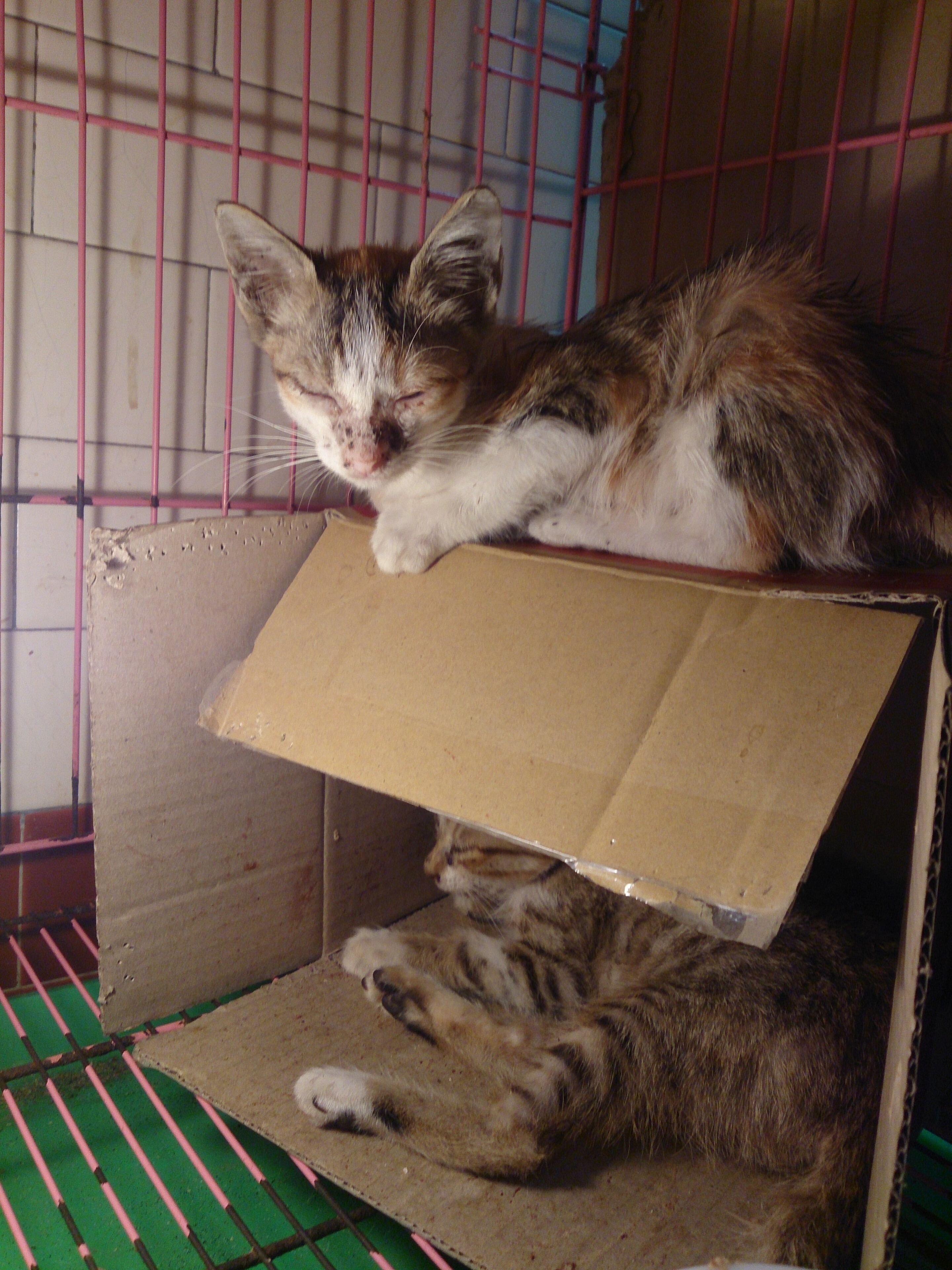 主題: 兩隻生病不吃臉上有痘痘的小貓 申請者姓名: 劉雅雲 花色: 申請日期: 2013-12-17 07:51:27 申請者部落格: 申請者臉書網址: 所在縣市/合作醫院: 高雄市/泰安動物醫院 治療費用: 3900元 需求人數: 9人 已結案 (2014-01-10 17:48:54) 報名人員: 曹小文(已付款)、戴珊珊(已付款)、beforn x2(已付款)、李脆脆 x2(已付款)、蔡欣蓓、Yuki Natumei(已付款)、WeiMin Lin(已付款)、蔡瑟芬(甘明又代繳納(已付款)、 候補人員: 動物病情說明: 每天我每天上班經過的市場,看到這兩隻跑到路邊,餵了一兩次可是都不太吃,這天經過他們又在路邊差點被車壓到,而且完全不吃怪怪的,一隻臉上有紅紅的一顆一顆像痘子,所以抓起來送醫治療, 病好了之後會幫他們找個家 動物近況說明: 貓咪就醫後精神還是不太好, 小的那隻5天後先走了去當天使了, 大一點的這隻目前變很乖了, 正在等一個家喔. 謝謝大家.
