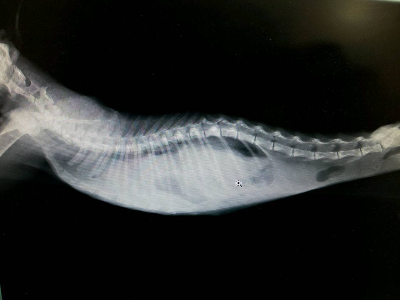 阿福已3個月大,但全身脫水嚴重,皮膚拉起完全無法彈回原狀,加上長期營養不良皮包骨,救援時只有700g。照了x光片發現他橫隔膜疝氣,已完全看不出肺臟,沾黏十分嚴重,且左後腳骨折,反射不良,亦需治療。
