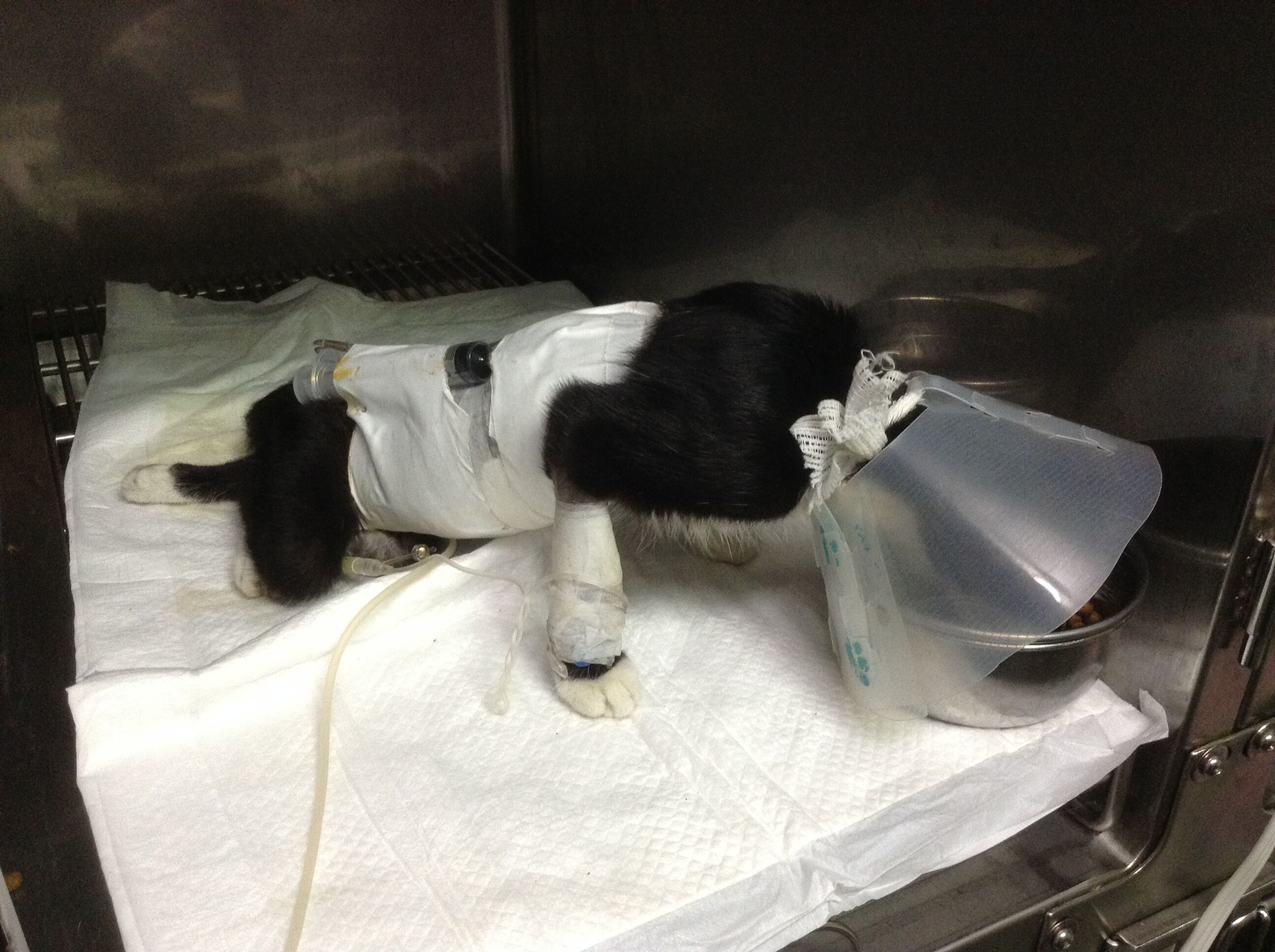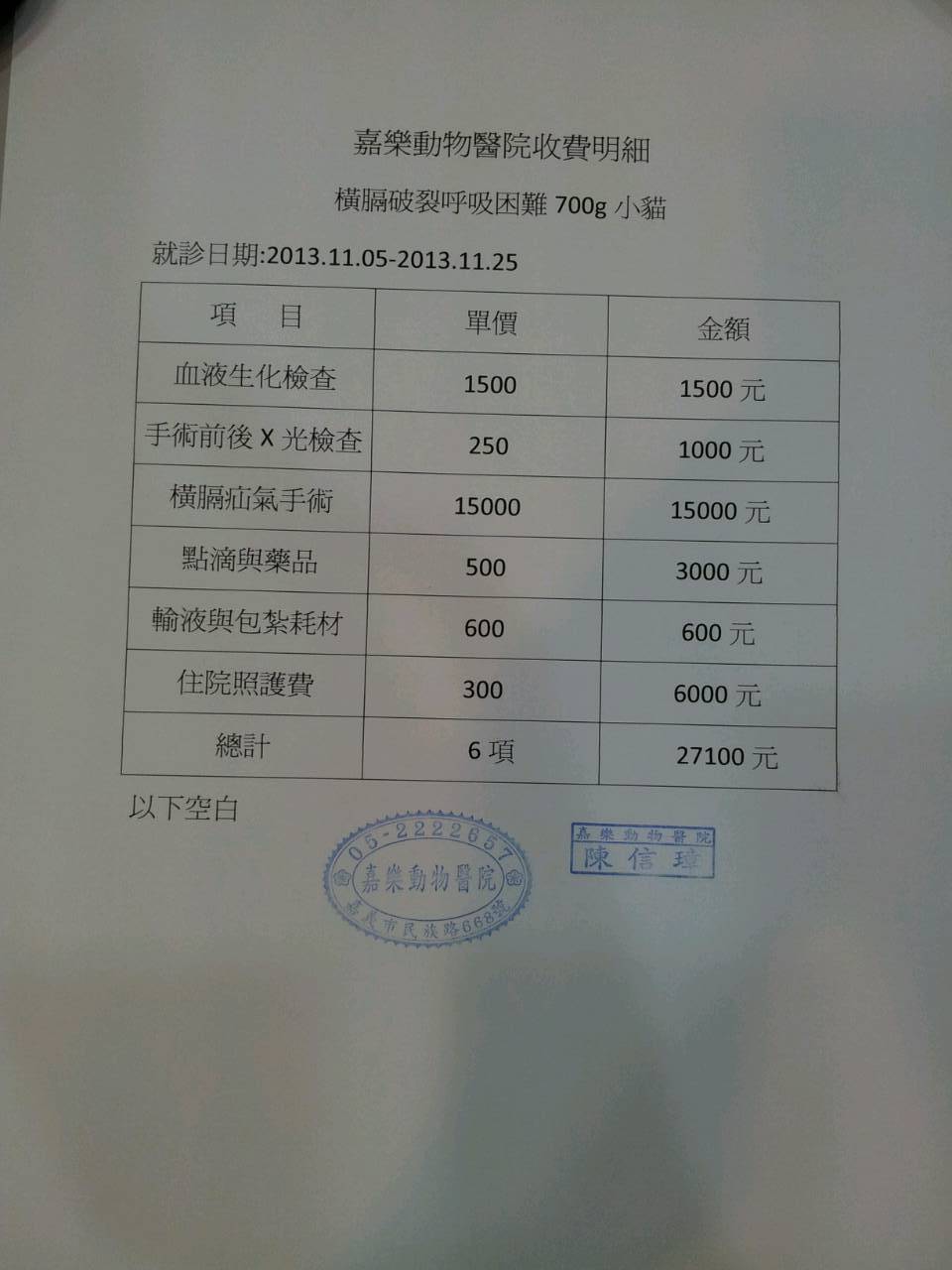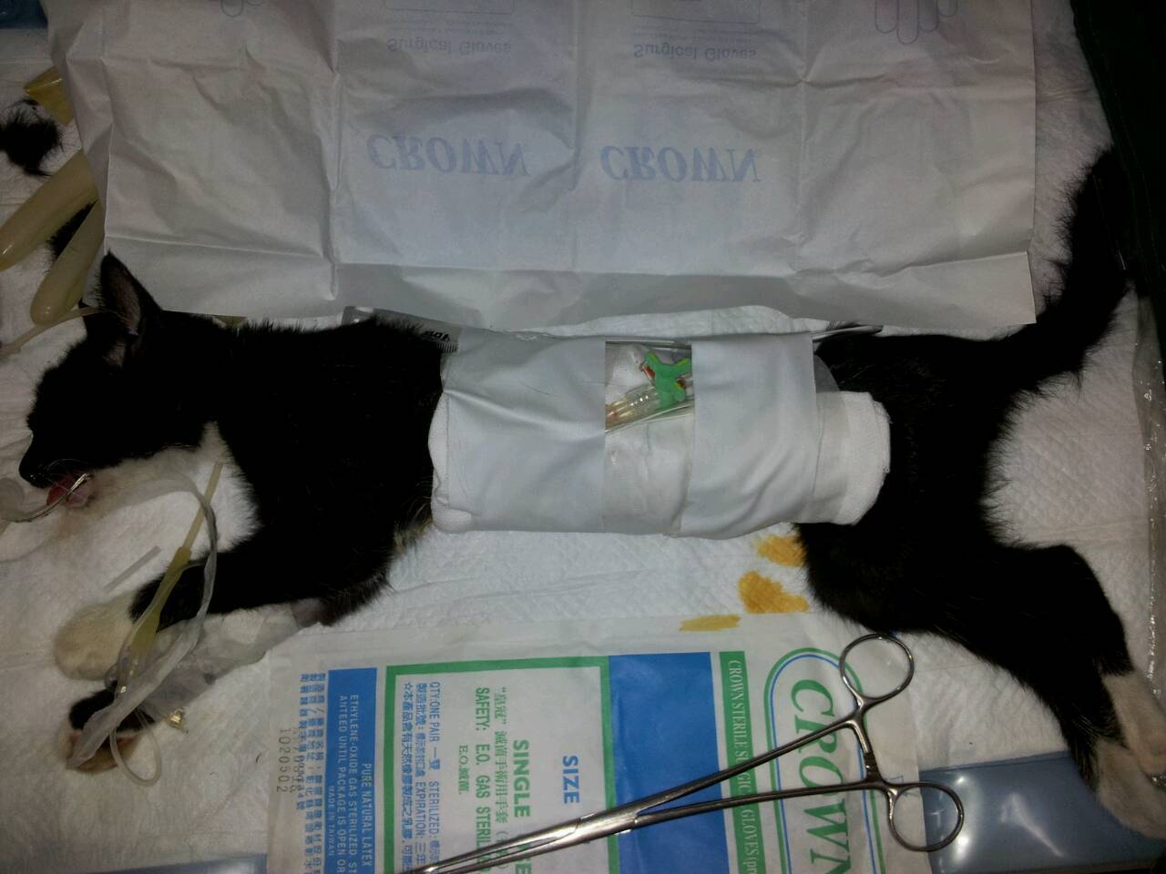 11/11阿福經連日來打皮下點滴,脫水情況、精神和喘氣的狀態都比先前好,體重亦回復到1.2公斤,麻醉上較安全,阿福所有器官都擠到肺臟,拖越久沾黏越嚴重,只會增加手術困難,故醫師評估後決定本日動刀。因為器官都跑到胸腔、要一個個歸位,腹部開的傷口很大,連胸骨都剪開,加上沾黏有點嚴重,手術困難,4個多小時天快亮才結束,故後腳骨折的手術這次沒有一起動刀,視貓咪恢復狀況、長大健康些再擇期動手術。