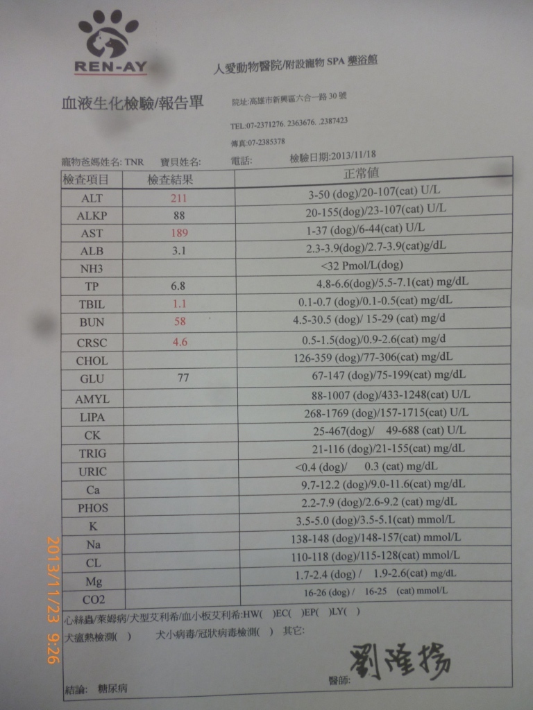 主題: 在自立路發現腸炎玳瑁貓咪 申請者姓名: 劉素鳳 花色: 申請日期: 2013-12-06 00:40:28 申請者部落格: 申請者臉書網址: 所在縣市/合作醫院: 高雄市/人愛動物醫院 治療費用: 4050元 需求人數: 5人 已結案 (2013-12-19 18:17:24) 報名人員: 尤品侖(已付款)、尤品侖(已付款)、迷你古柏(已付款)、Kristy Lee(已付款)、王玉珊(已付款)、 候補人員: 動物病情說明: 在自立路發現的玳瑁~原本單純想送結紮~醫生麻醉後發現發現此貓肛門沾滿泥便!底盤也有!取大便做糞便檢查並無蛔蟲,球蟲等內寄生蟲之蟲卵,因為是年輕貓所以擔心是貓瘟或其他疾病所引起之腸炎!所以先驗血且術後先以行點滴支持療法~再配合臨床治療! 動物近況說明: 由於肝腎指數偏高~院長判斷應該是亂吃引起的中毒~大便中也有ㄧ些雜質~因為玳瑁貓咪病情較輕~在點滴3天之後狀況得到改善~除了後續治療~給予食物也沒有再拉肚子~狀況穩定後就出院了喔
