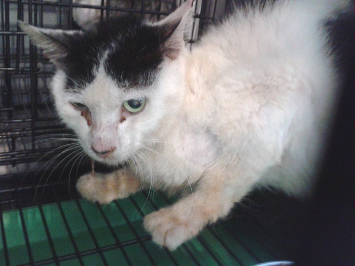 是在數月前誘捕萬華區浪貓結紮時..發現了牠..當時走路慢慢的.嘴內流著口水(口炎).鼻氣管聲音很大聲+毛髮亂亂的..一看就知道有生病..
