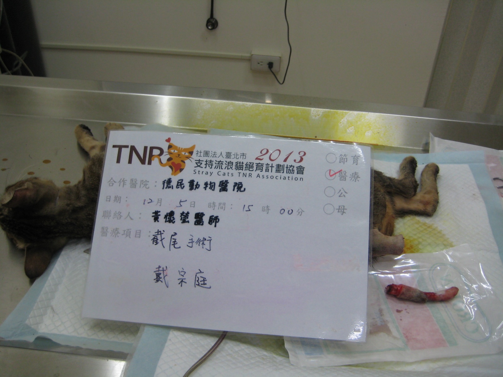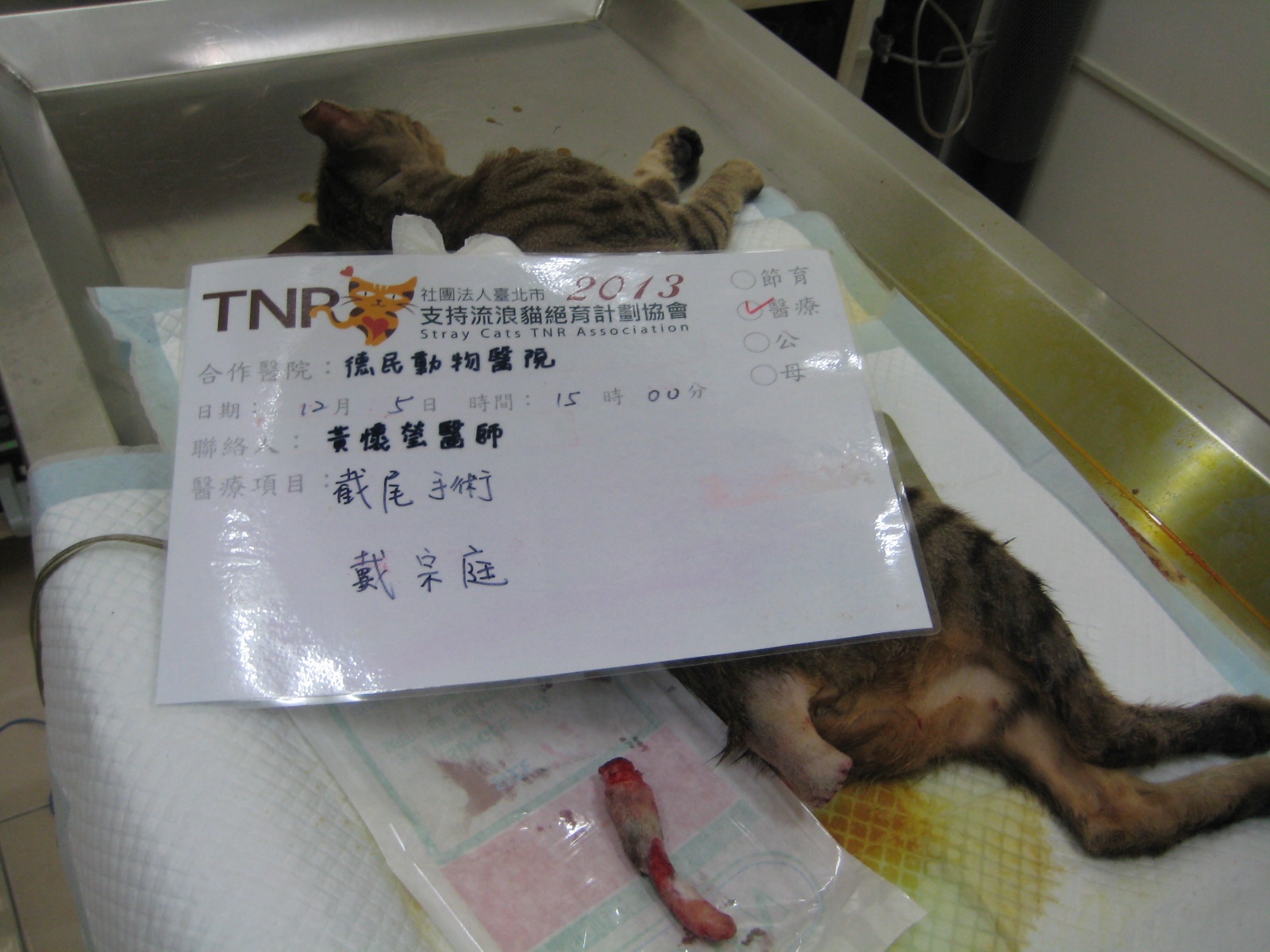 主題: 貓咪尾巴壞死需截尾 申請者姓名: Sexson Dai 花色: 申請日期: 2013-12-11 00:44:25 申請者部落格: 申請者臉書網址: 所在縣市/合作醫院: 高雄市/新德民動物醫院 治療費用: 3500元 需求人數: 8人 已結案 (2014-01-10 17:47:07) 報名人員: 思惟宗道(已付款)、Hong Zhen Lin(已付款)、Shiouwen Huang(已付款)、佩欣(已付款)、Renee Lin(已付款)、曹小文 x3(已付款)、 候補人員: 動物病情說明: 你好,我有帶流浪貓到高雄德民診所做結育,但貓咪尾巴有傷,醫生說要結掉一斷,所以我要申請醫助,但貓咪的結育費用我可以全部資助,麻煩你們了,謝謝 動物近況說明: 醫生說貓咪傷口癒合狀況良好,身體健康也不錯,爾後我會持續觀察貓咪