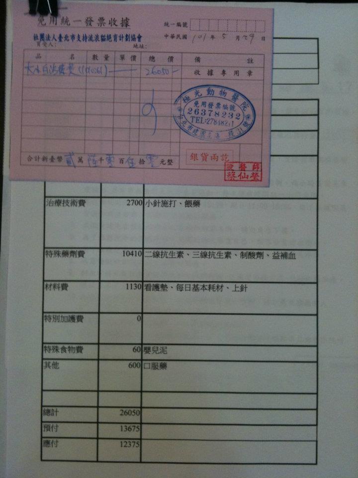 主題: 嚴重感染加貧血的街貓 申請者姓名: Juste Tsai 花色: 申請日期: 2012-05-30 22:17:06 申請者部落格: 申請者臉書網址: 所在縣市/合作醫院: 台北市/其他院所醫助專案(醫院請先MAIL溝通) 治療費用: 26050元 需求人數: 28人 已結案 (2012-06-15 13:58:37) 報名人員: 平野耕太(已付款)、小舟(已付款)、Emily Chou(已付款)、Emily Chou(已付款)、Jessica I-Chin Pan(已付款)、Jill S.(已付款)、花花草草(已付款)、Juste Tsai(已付款)、Juste Tsai(已付款)、Flora(已付款)、Kuo Liang(已付款)、吉兒(已付款)、Vinsent Chen(已付款)、Lai Fhifhi(已付款)、蔡黑黑(已付款)、Eligh Liu(已付款)、Dorothy Wang(已付款)、Shih Ju Chiu(已付款)、Amirose Hsieh(已付款)、Debby Chen(已付款)、Angus(已付款)、jimmy(已付款)、Nina Chong(已付款)、許芳予(已付款)、Juen-Nien Lin(已付款)、selina(已付款)、Ethan Chang(已付款)、jimmy(已付款)、 候補人員: 小舟、小舟、 動物病情說明: 平日照顧的街貓於5/12開始不吃不喝,加上沒精神,於是送醫治療,檢查後發現有血痢、腸胃出血、嚴重感染(白血球高達六萬)、嚴重貧血(HCT 13%,瀕臨輸血地步,曾波文緊急徵求血貓),5/17請求TNR協會幫忙轉院後,住院10天已恢復的差不多,白、紅血球皆逐漸回到正常狀態,於5/27出院,現原地野放由愛爸調理,並投以抗生素、補血劑及胃乳當中。