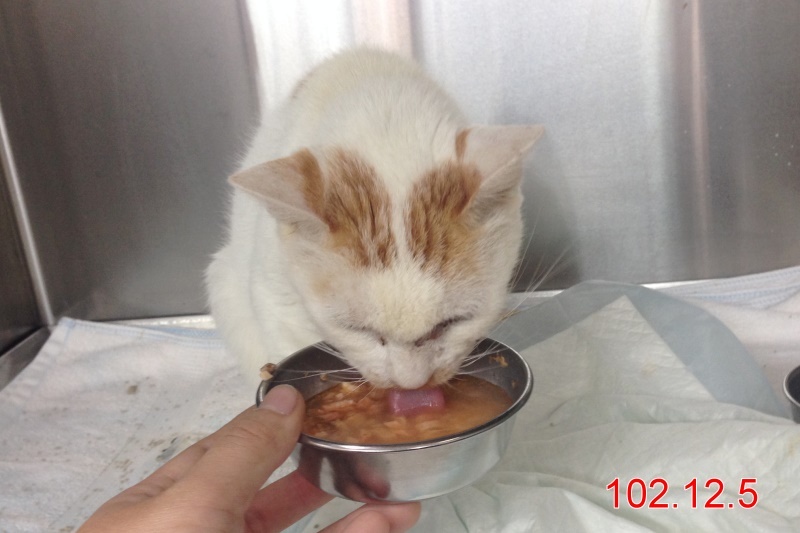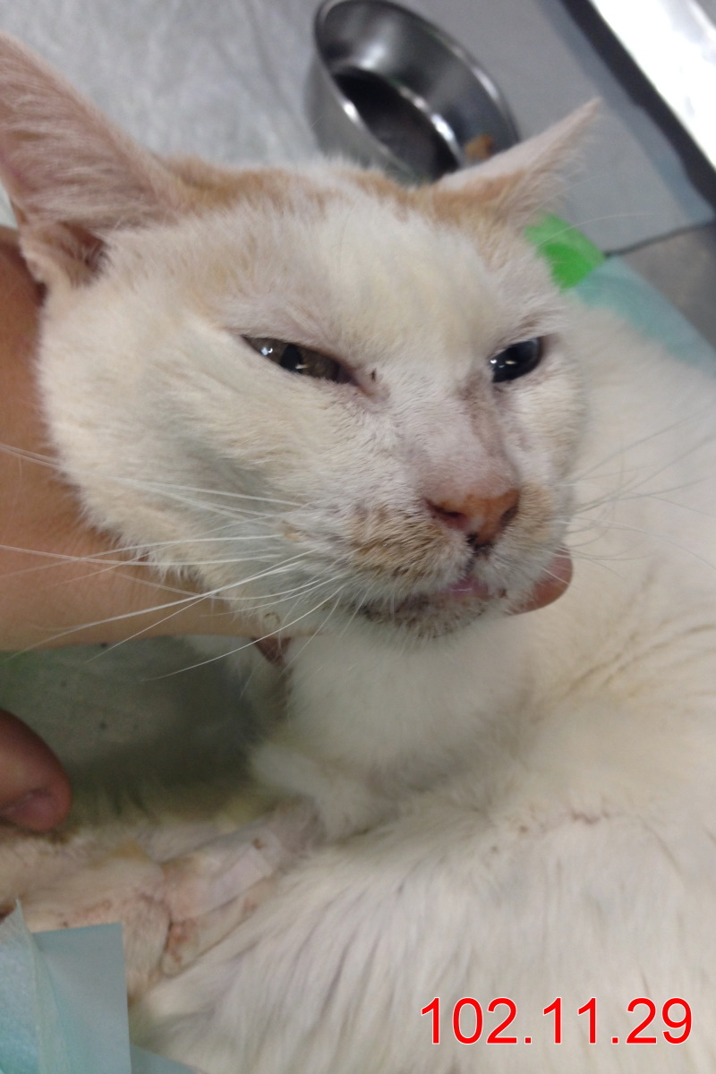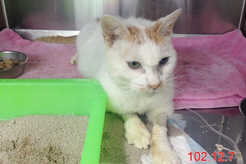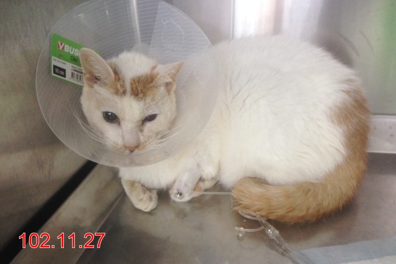 還好,貓很爭氣,加上醫院適當的照顧,終於漸漸的好轉,但又發現,此貓有腎衰竭現像,需要每天打水,原餵養他的阿桑已經90多歲,也無能力照顧這貓,又無適當中途可以接手照顧,於是先安排至協會安置,平日由協會人員照顧。