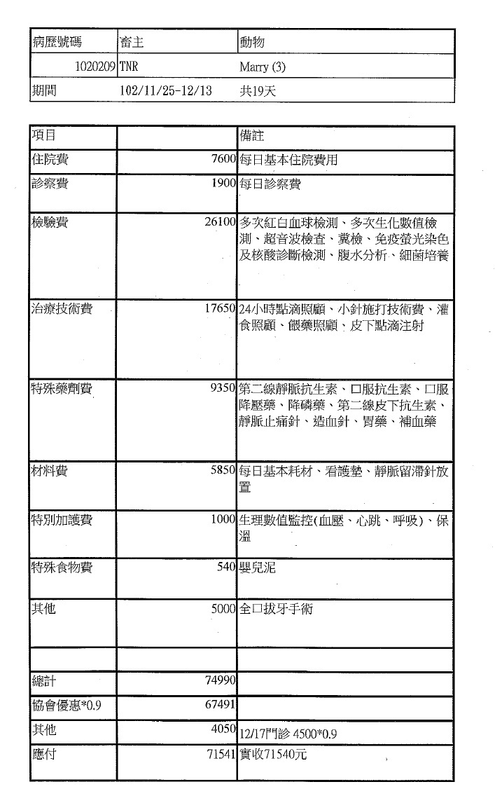 主題: 血腹、貧血腎指數飆高的Mary 申請者姓名: 臺北市支持流浪貓絕育計劃協會 花色: 申請日期: 2013-12-19 19:43:35 申請者部落格: 申請者臉書網址: 所在縣市/合作醫院: 台北市/極光動物醫院 治療費用: 71540元 需求人數: 74人 已結案 (2014-01-10 17:41:20) 報名人員: Vinz x8(已付款)、Emma WU(已付款)、Rebecca Chen x5(已付款)、Sharpay Huang(已付款)、許橘子(已付款)、Ning Ning(已付款)、虎咪(已付款)、Penny Deng(已付款)、beforn(已付款)、小黃(已付款)、philip x2(已付款)、Chen Chris(已付款)、Hsin-Yi Chiao(已付款)、leslie12956(已付款)、Betty Lee(已付款)、王靜雯、王靜雯、At The Beginning x10(已付款)、TzuPing Chiu(已付款)、Yilan(已付款)、Carry Chen(已付款)、余蛋娘(已付款)、Daniel Yeh x2(已付款)、Nana Huang x2(已付款)、Jong Chia Liu(已付款)、Annisui Strauss(已付款)、陳碧喵(已付款)、np0041(已付款)、Jeanine An(已付款)、Annisui Strauss、Jocelyne YuYu Kao x2(已付款)、小葆蓓(已付款)、游玉晨(已付款)、王恩沂(已付款)、王可樂的日語教室 x2(已付款)、老皮(已付款)、hungers(已付款)、Sherry Li(已付款)、Forest(已付款)、Yen-Yuan Wang(已付款)、Bindi Chen(已付款)、Zephyr Su(已付款)、陳喵喵(已付款)、Ivan Wang(已付款)、Ivan Wang、Ivan Wang、Ivan Wang、Josie Josie(已付款)、Aiko Wan(已付款)、Sumi Ho(已付款)、Polly Ma x2(已付款)、郭銘賢(已付款)、Sabrina Cheng x2(已付款)、 候補人員: 楊苺苺、Summer、 動物病情說明: 102.4.15