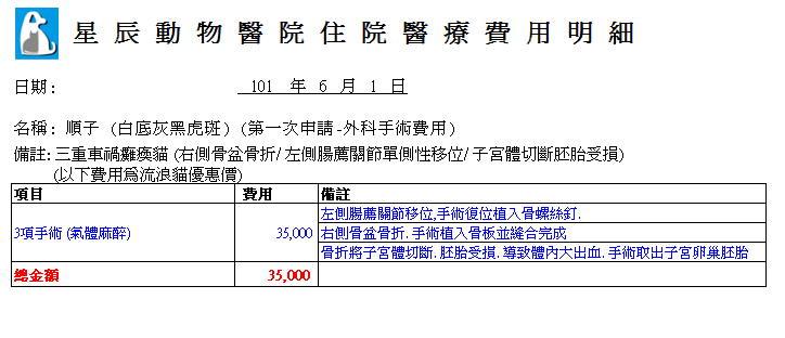 主題: 三重車禍骨盆重傷孕貓-第1次申請手術費用 申請者姓名: 敏大哥 花色: 申請日期: 2012-06-01 16:29:21 申請者部落格: 申請者臉書網址: 所在縣市/合作醫院: 台北市/星辰動物醫院 治療費用: 35000元 需求人數: 38人 已結案 (2012-12-01 19:57:15) 報名人員: Huitzu Wu(已付款)、Amirose Hsieh(已付款)、philip(已付款)、ミルク ミルク(已付款)、WeiLin Chen(已付款)、阿吉(已付款)、叭噗(已付款)、放客女伶(已付款)、Claus(已付款)、Vicky Huang(已付款)、小舟(已付款)、Vivienne Sun(已付款)、王小曼(已付款)、羅習華奶奶(已付款)、Catherine Du(已付款)、Joyce Chang(已付款)、福祿壽(已付款)、SHIN HUI(已付款)、SHIN HUI(已付款)、SHIN HUI(已付款)、培根(已付款)、王麗惠(已付款)、嘟嘟(已付款)、嘟嘟(已付款)、嘟嘟(已付款)、嘟嘟(已付款)、嘟嘟(已付款)、嘟嘟(已付款)、嘟嘟(已付款)、嘟嘟(已付款)、嘟嘟(已付款)、嘟嘟(已付款)、M(已付款)、Juen-Nien Lin(已付款)、張靈脂(已付款)、Welltea Wu(已付款)、bijin(已付款)、Angel Chao(已付款)、 候補人員: 叭噗、小舟、小舟、 動物病情說明: 三重網友李先生通報發現路倒貓,求援"請支持流浪貓TNR計劃協會",由我救援送醫至星辰動物醫院. 吳醫師研判疑似車禍造成癱瘓,拍X光確診這隻母貓已懷有身孕了! 腹腔胎兒約2週. 右側骨盆骨折. 左側腸薦關節移位. 需要開刀打骨板和骨釘接合.