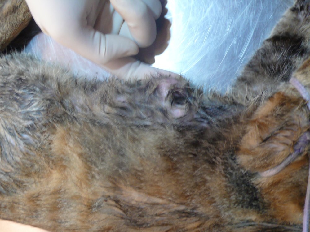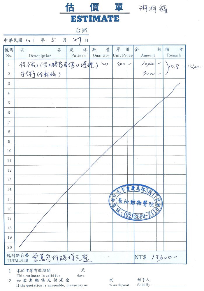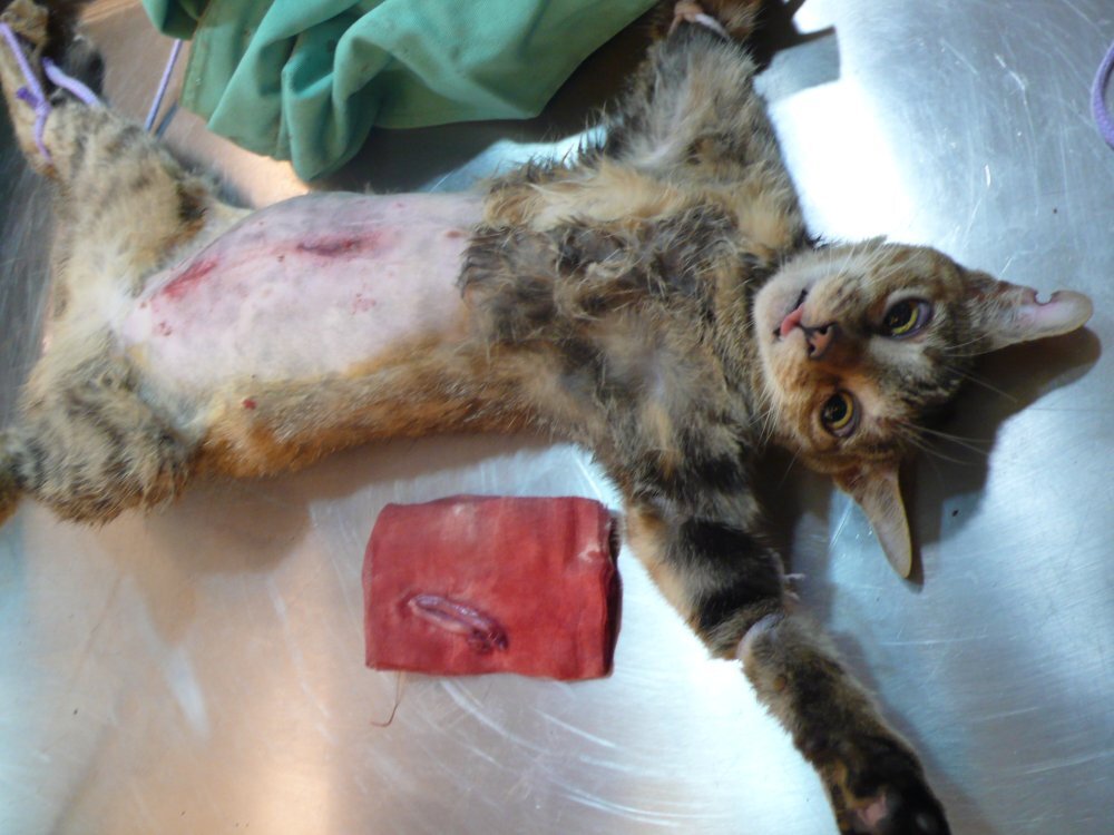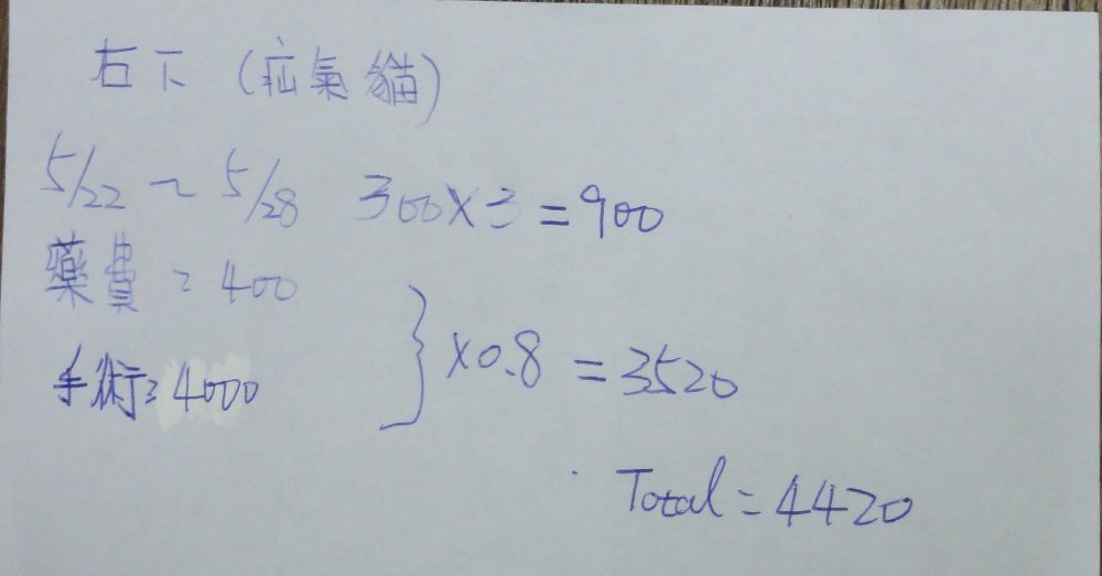 第一隻虎斑母貓,則是童小姐於5月22日所誘捕,結紮時發現肚子有一處疝氣,內臟突出表皮,結紮時順便進行了縫合手術,所以肚子上有二道傷口,此貓也已經復原放回,醫療費用為4420元。
