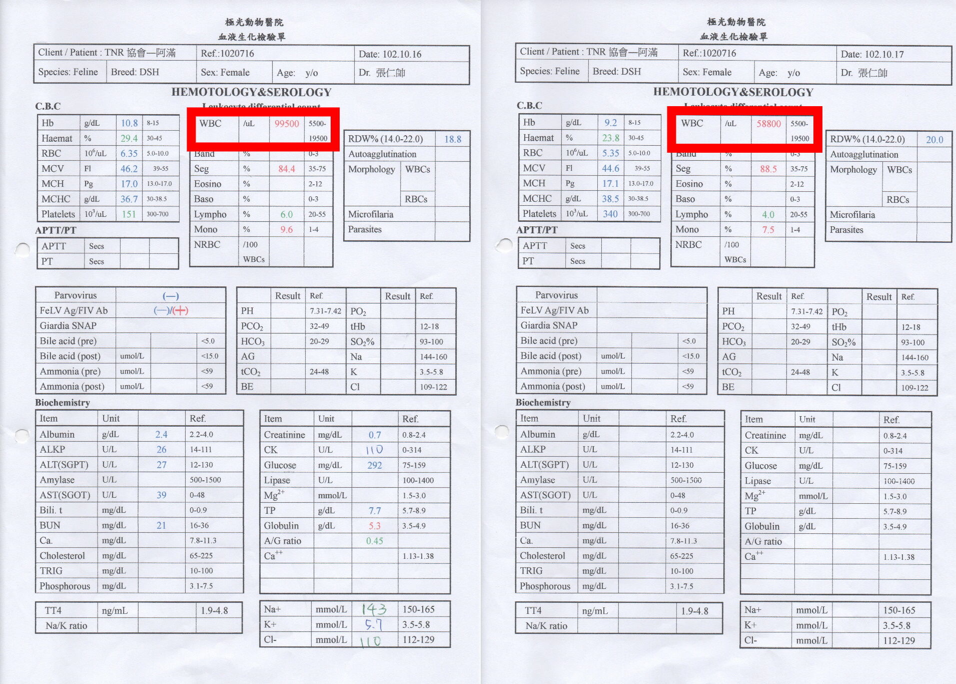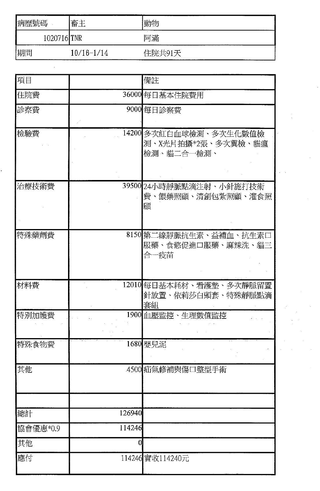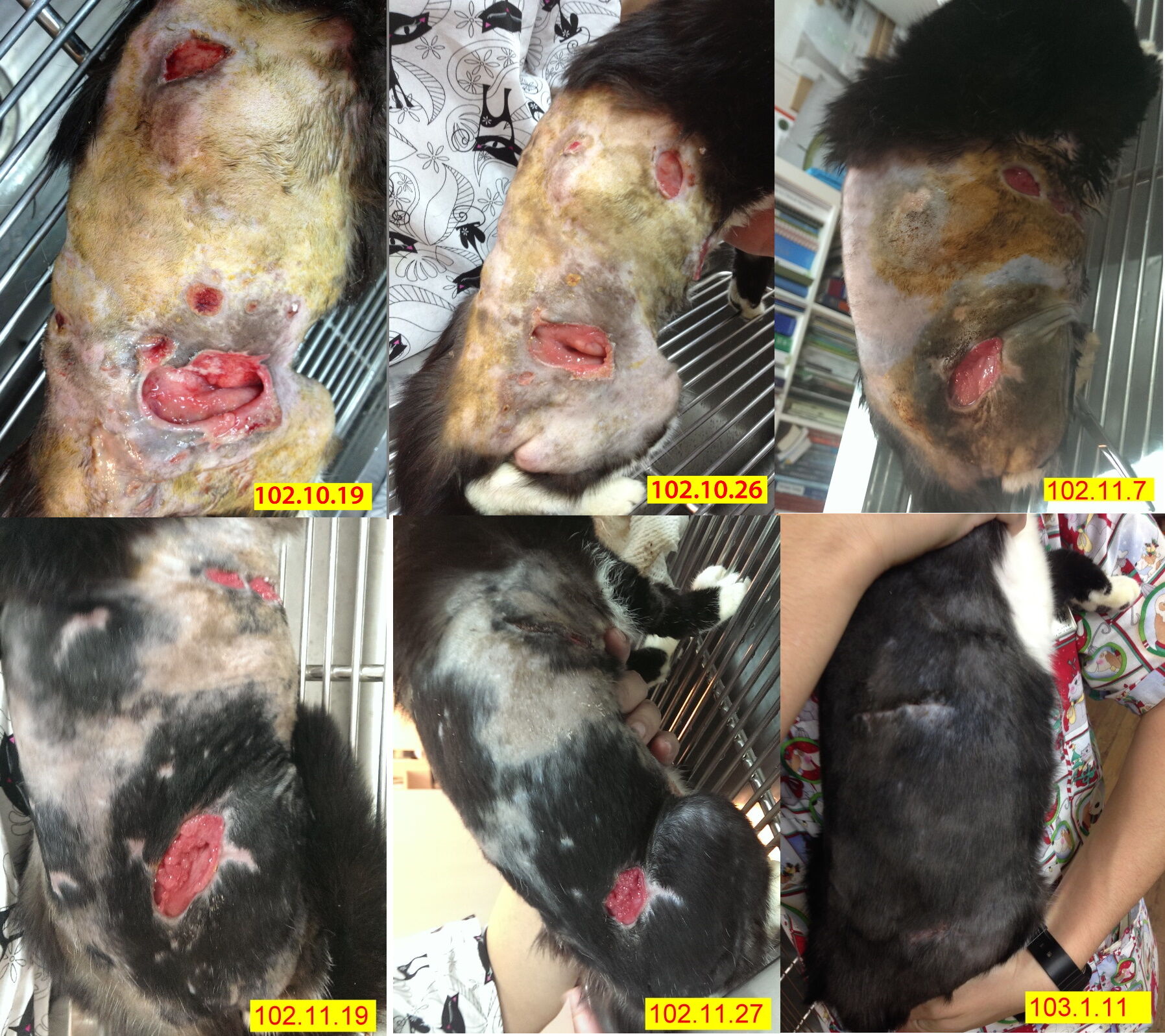 主題: 被狗啃咬的破布娃娃--阿滿 申請者姓名: 臺北市支持流浪貓絕育計劃協會 花色: 申請日期: 2014-01-11 19:37:22 申請者部落格: 申請者臉書網址: 所在縣市/合作醫院: 台北市/極光動物醫院 治療費用: 114240元 需求人數: 118人 已結案 (2014-03-24 18:17:38) 報名人員: Jaly Chen x2(已付款)、Sunny Sun(已付款)、Anita Cheng(已付款)、Ni(已付款)、Yu Keng Tsai(已付款)、Kite Tsai(已付款)、張瑜真(已付款)、Chloe Liang(已付款)、Moon(已付款)、Patrick x2(已付款)、Joyce914(已付款)、Puffy(已付款)、Connie Wu、星星小蘋果(已付款)、小瓜(已付款)、潼潼、Jong Chia Liu(已付款)、徐米奇(已付款)、J(已付款)、盧穎新(已付款)、iMADOKA(已付款)、Chewei Chang(已付款)、Micky Yang(已付款)、Micky Yang(已付款)、小黃(已付款)、小富、蒲曉萍(已付款)、philip(已付款)、philip(已付款)、貓小玉(已付款)、假不妙 x2(已付款)、小恩(已付款)、vivian(已付款)、Wendy(已付款)、YPing(已付款)、ZLIN(已付款)、kailing(已付款)、Ping Hussard(已付款)、Irene Yen x3(已付款)、Way Chen(已付款)、LaLa Cheng(已付款)、蔡猴子、nina(已付款)、球球(已付款)、Wei Lin x2(已付款)、Eeron Hsi(已付款)、陳義霖、陳義霖 x2(已付款)、無名氏(已付款)、Betty Ou(已付款)、Nix Lin(已付款)、Hana Erica Yang(已付款)、Shiou-men Huang(已付款)、Eatting Wong(已付款)、Sue Chen(已付款)、徐阿悟(已付款)、Eugene(已付款)、柯元傑(已付款)、Wendy Cheng(已付款)、Mimi Liu(已付款)、Staru Chang(已付款)、Bella Lin(已付款)、Eva Tsai、Ppn Huang(已付款)、Wei Lin(已付款)、Jessie Chen(已付款)、Sandrine Hung(已付款)、Chingching Chen(已付款)、DK(已付款)、ERic YU x2(已付款)、Karen Biddle(已付款)、貓娘、Po-Lin Chen x2(已付款)、櫻花妹(已付款)、虎口(已付款)、Amber Tsai(已付款)、Ku Yo Liu(已付款)、Ku Yo Liu、陳倩婷 x2(已付款)、Veara Lin(已付款)、Candice Chao、Yen-Yuan Wang(已付款)、Bubu Wang(已付款)、Gracelyann(已付款)、陳飛(已付款)、Rui DI KE、貓奴 x2(已付款)、Queenie(已付款)、Angeline Wen、Angeline Wen、Jessica C. Chang(已付款)、吳那那(已付款)、王宣涵(已付款)、謝佳紋(已付款)、purism(已付款)、Yuki Natumei(已付款)、Kero Yen(已付款)、Zheng(已付款)、Linus(已付款)、Bella Yao(已付款)、lesley0253(已付款)、SuFen Fu(已付款)、罐頭(已付款)、FangRu Chou(已付款)、胡云云(已付款)、陳世昇 x3(已付款)、leelpr(已付款)、郭毛(已付款)、小四 x3(已付款)、Wendy Tseng(已付款)、lunyi(已付款)、Betty Ou(已付款)、WeiLin Chen x2(已付款)、alicelin(已付款)、 候補人員: Gary Chen、Nolen Hsu、Summer、 動物病情說明: 102.10.16中和收容所救援,疑似被狗或者車禍奄奄一息的阿滿,側腹胸腔潰爛滿滿都是組織液和不明物體,虛弱無力兩眼無神,緊急送往醫院,血檢白血球高達99500(正常值在兩萬以下)非常嚴重的感染,傷口周圍潰爛,腹壁受損疝氣,蛋白質太低,組織液太多,狀況非常不樂觀,緊急輸血漿、清創,發現傷口呈對稱,橫跨胸壁和腹壁,比較像是狗咬傷,傷口遍佈雙側腹,整個皮膚破破爛爛慘不忍睹,所幸感染慢慢的到控制,每天清創上敷料包紮阿滿都很配合,但因為阿滿血檢愛滋陽性,傷口難以復原,經過三個月的治療,阿滿恢復健康,個性很撒嬌,醫療費用還請各位幫忙。