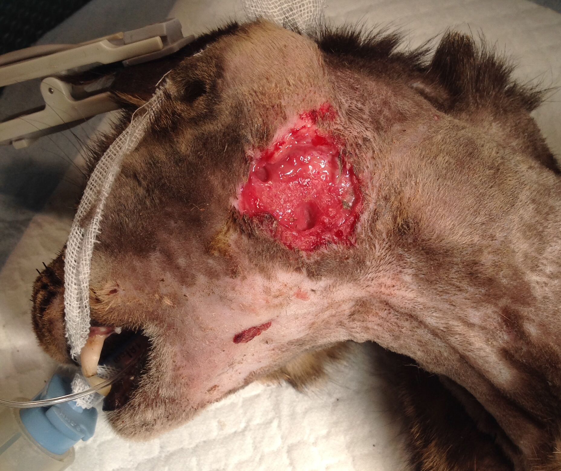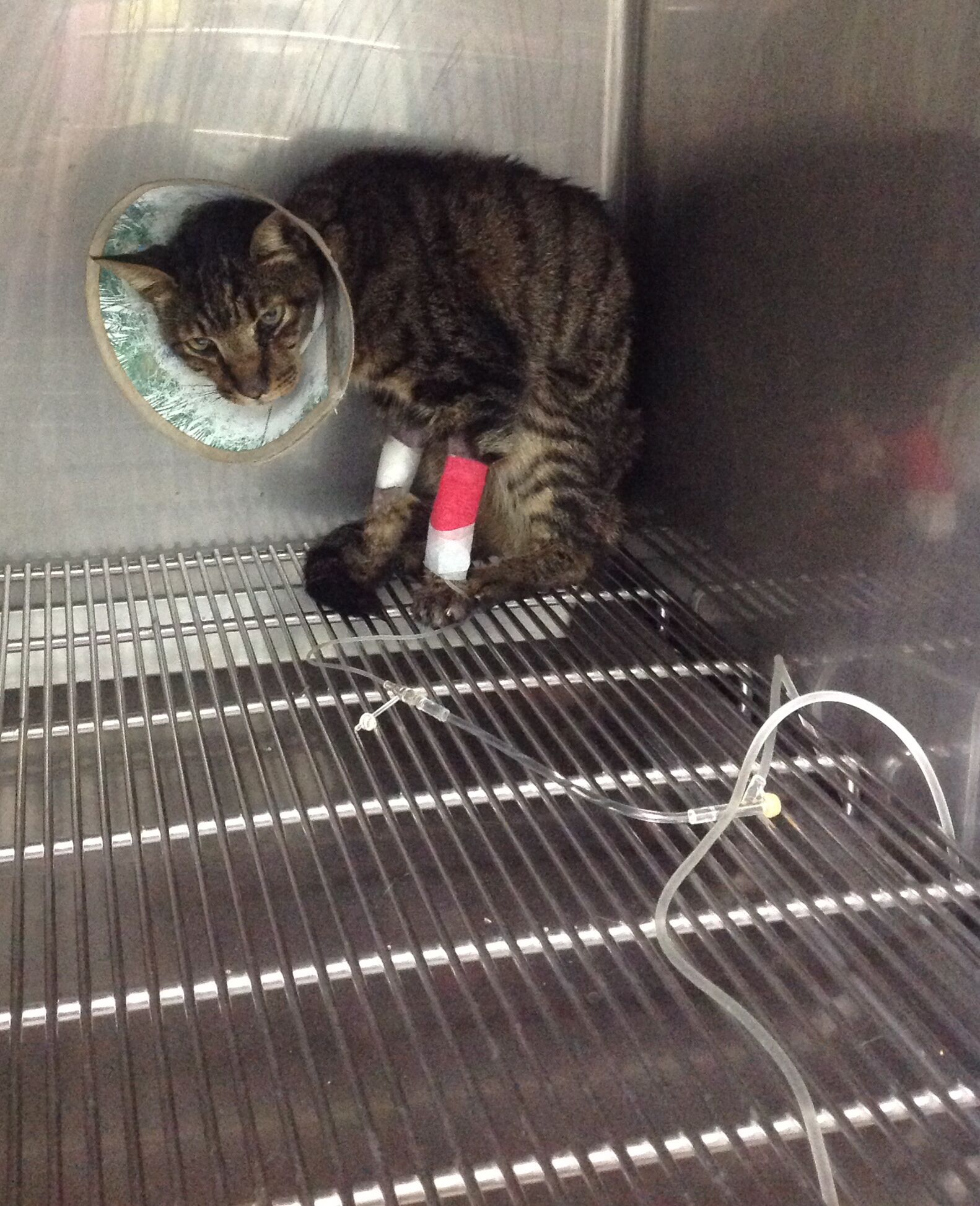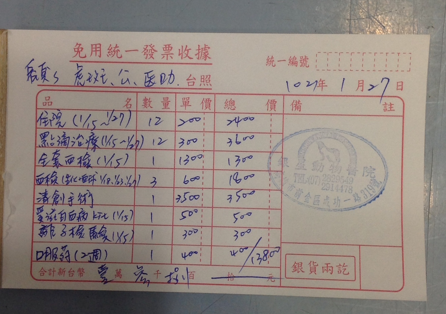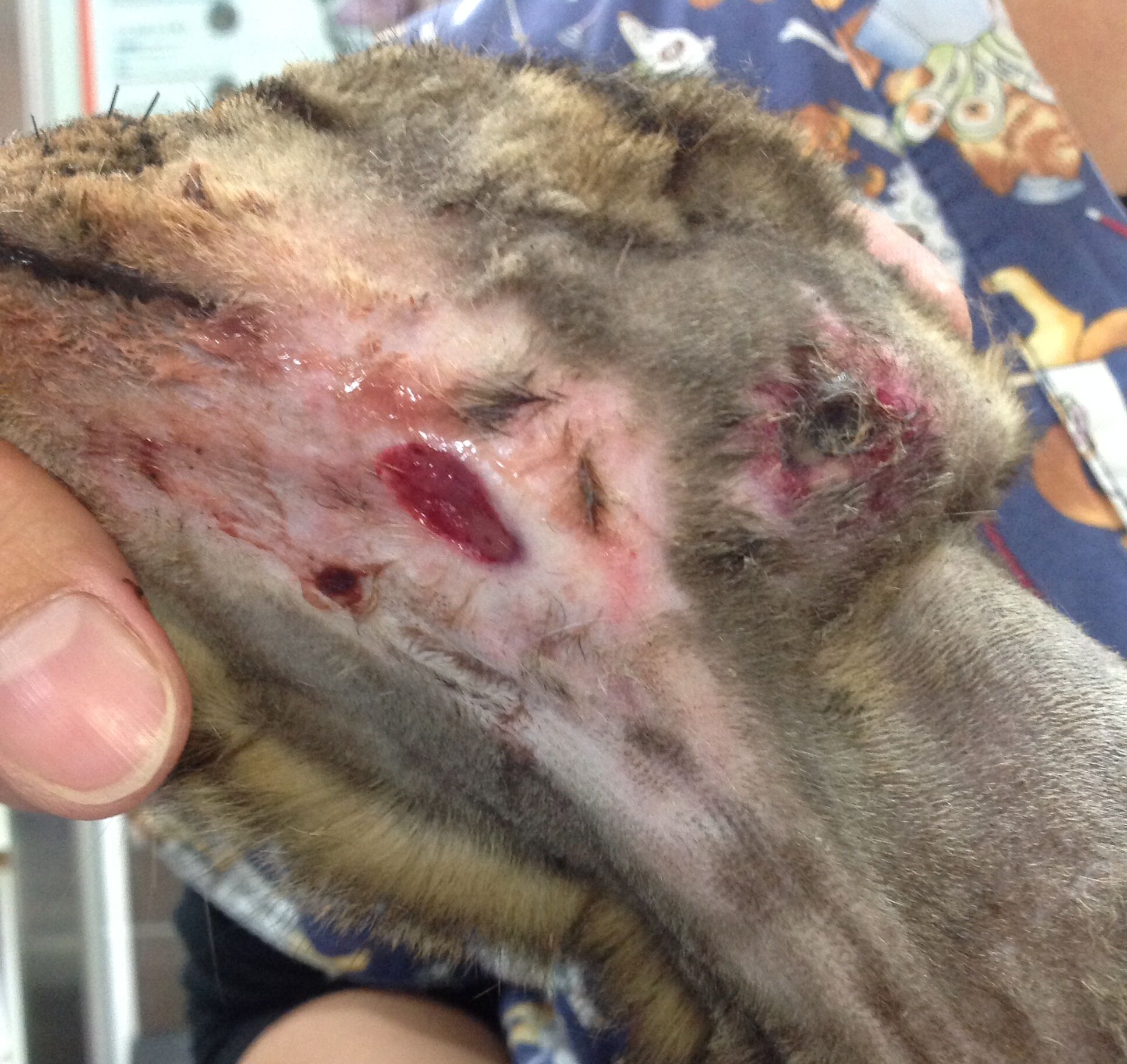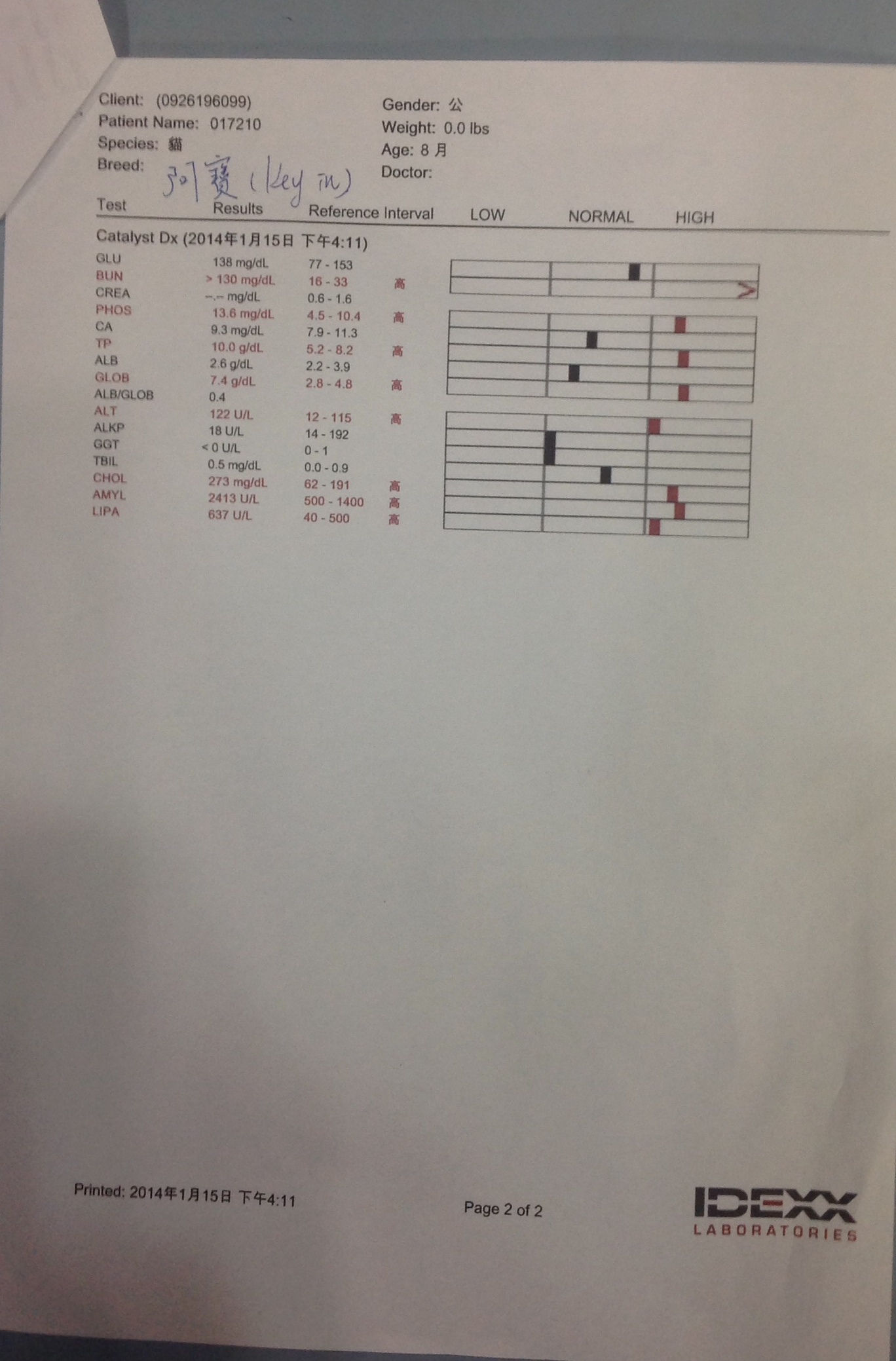 緊急送往銀星動物醫院,經過驗血發現阿寶的腎衰竭指數破表、白血球破萬,腮幫子的傷口稍微清理後需等腎衰竭指數下降才有辦法開刀清創...