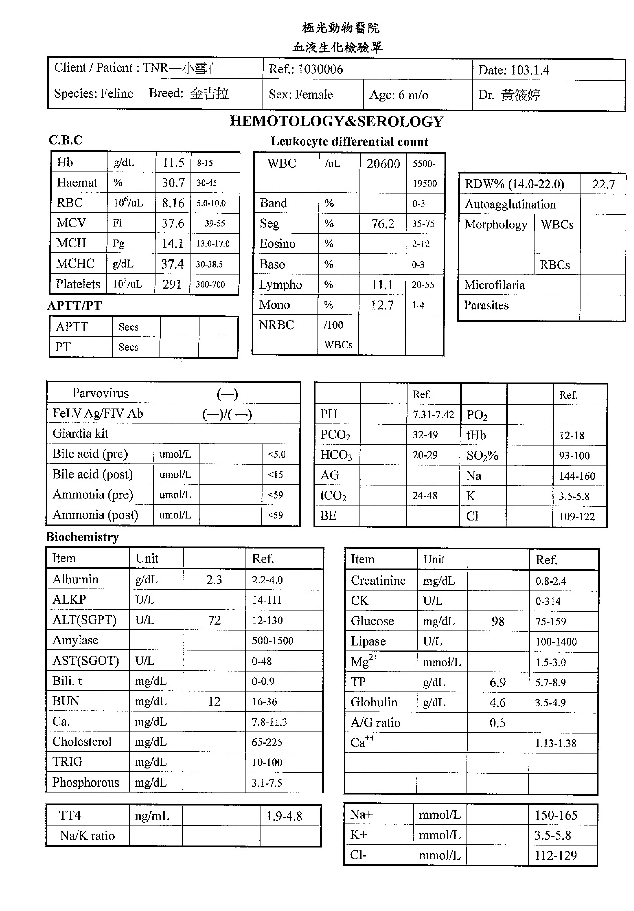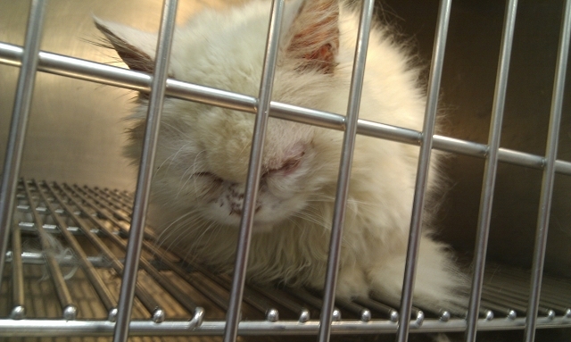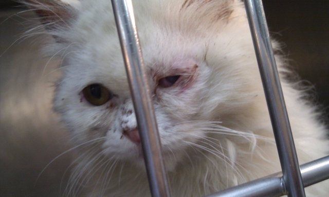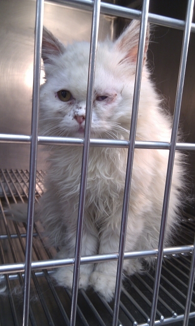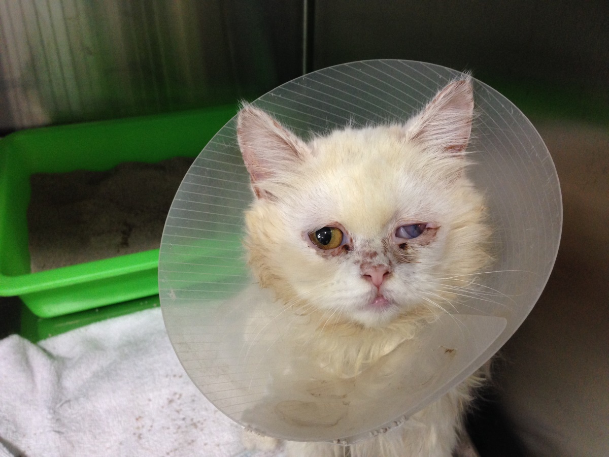 小雪白送醫血檢無愛滋白血、白血球偏高,體重偏輕,看起來膨膨的摸起來都是骨頭,毛髮打結成塊,耳朵感染嚴重,噴嚏連連,眼睛分泌物也很多,左眼萎縮,先給予抗生素和噴霧治療感冒,點眼藥水幫助減少分泌物,治療十天後狀況改善許多已先帶回安置照顧,等大一點再進行評估,若沒多分泌物,不一定需要摘除萎縮的眼睛,但如果會產生過多的分泌物就有感染的可能,手術就必須進行,醫療費用還請大家幫忙。