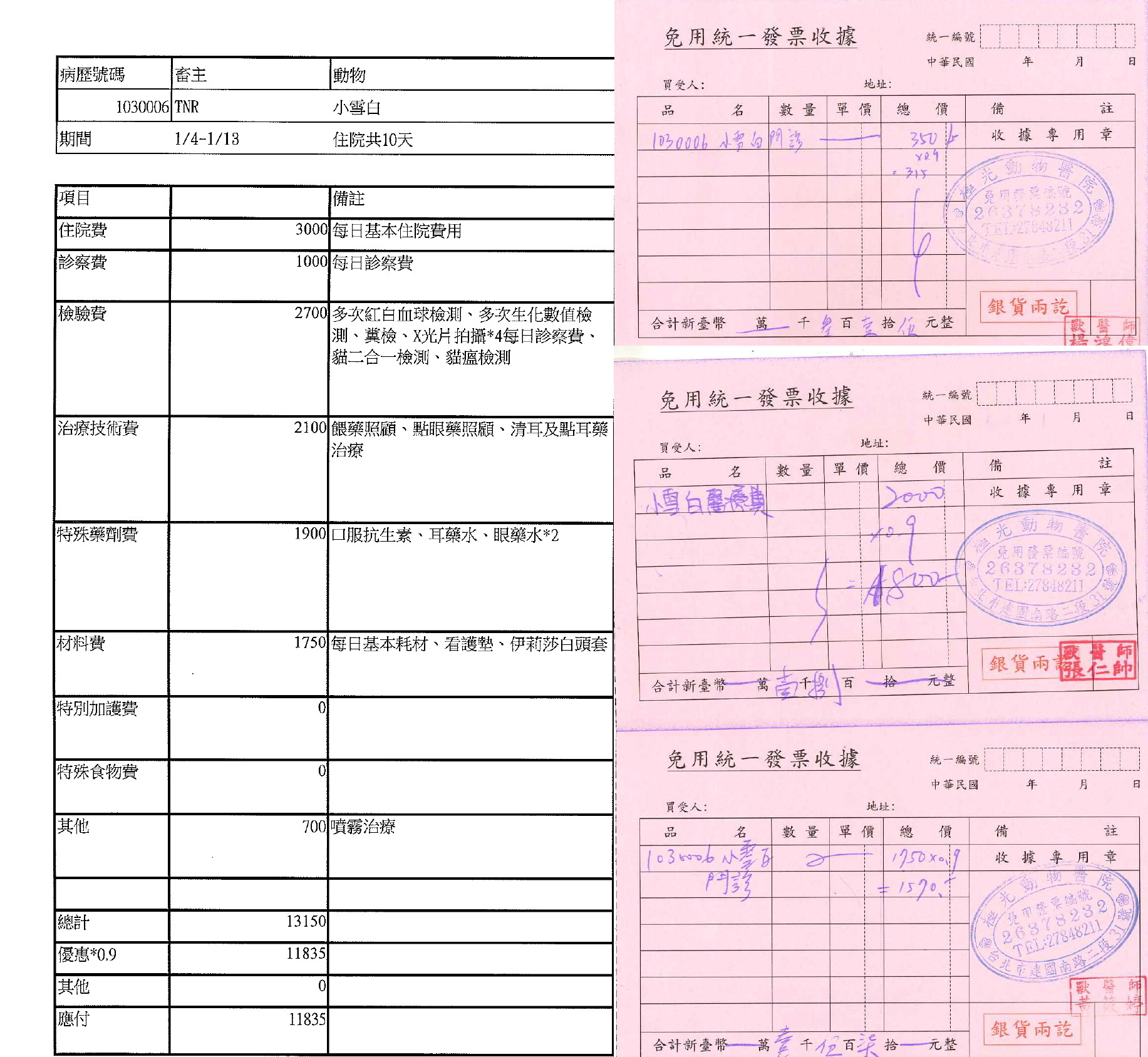 主題: 倒臥路邊眼睛感染嚴重的小雪白 申請者姓名: 臺北市支持流浪貓絕育計劃協會 花色: 申請日期: 2014-01-29 23:44:01 申請者部落格: 申請者臉書網址: 所在縣市/合作醫院: 台北市/極光動物醫院 治療費用: 15620元 需求人數: 17人 已結案 (2014-03-24 18:11:26) 報名人員: 王大咪(已付款)、辛夷、Venson Ku(已付款)、Yahui Chung、lsf330(已付款)、無名氏、無名氏(已付款)、JC(已付款)、Vincent Ho(已付款)、Kim Meng(已付款)、agnes(已付款)、Paulala Chin(已付款)、lavinia x2(已付款)、imsa(已付款)、Yu Ting Tseng(已付款)、Jerry Ho、JasmineC(已付款)、凱特(已付款)、Vicky Chang Shyr(已付款)、小四(已付款)、 候補人員: meemee、張佩瑜、 動物病情說明: 民眾通報: