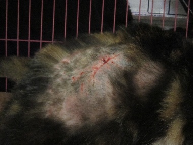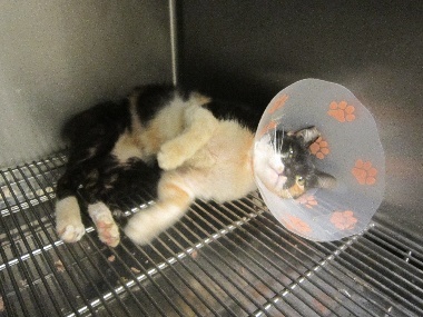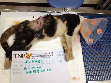 結果在一台車旁看到一隻不認識的貓,想靠近去餵牠吃罐頭,結果發現牠的背部有一大片傷口,趕緊打電話給朋友請她帶籠子過來,誘捕送醫檢查,醫生說疑似被咬傷,傷口已經化膿,於是安排晚上手術, 手術過程中發現2側都有受傷,也有3個齒痕印,有一邊傷口很大做了清創縫合,術後還裝了引流管,醫生發覺牠口腔有異味,懷疑是不是腎臟不好,於是有做血液檢查,還好檢查結果肝腎指數都還ok.也順便於手術中做了洗牙,已經是6.7歲年紀有點大的貓了。術後要住院觀察傷口癒合狀況,每天都還要做傷口清創,吃抗生素等,希望貓咪能趕快好起來。動物近況說明: 貓咪已於2月21日拆線.接回照顧.等天氣暖和些.毛長出後再放回.