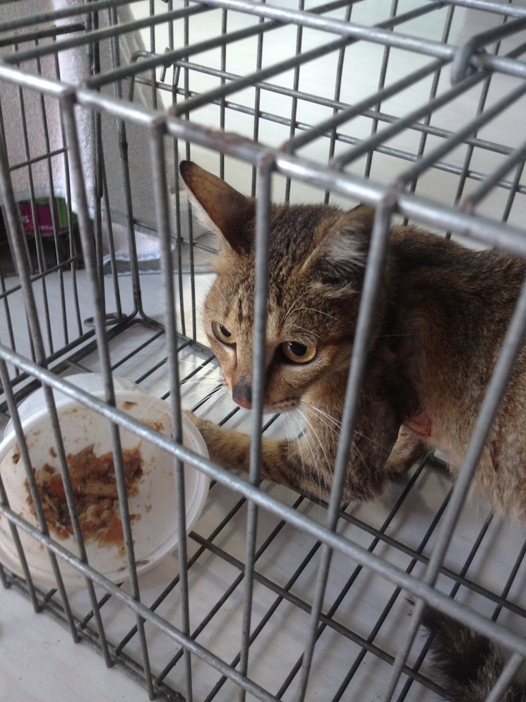 主題: 橡皮筋貓 申請者姓名: 貓柔柔 花色: 申請日期: 2014-02-08 00:16:14 申請者部落格: 申請者臉書網址: 所在縣市/合作醫院: 台中市/毛導動物醫院 治療費用: 9080元 需求人數: 11人 已結案 (2014-03-24 18:09:23) 報名人員: ZLIN(已付款)、Stephen(已付款)、黃士洵 x2(已付款)、YiLing Li(已付款)、婷婷(已付款)、婷婷、婷婷、世勳的小甜心、婷婷、Li Bear(已付款)、ERic YU(已付款)、錢快來(已付款)、小四 x2(已付款)、 候補人員: 山豬小孩、 動物病情說明: 橡皮筋貓咪~ 某天看到這隻很瘦小的貓咪在公司旁邊車子底下難以吞嚥的吃著飼料,脖子上有一圈很深的傷口,一看就覺得應該是橡皮筋造成的,而且腳還怪怪的舉著,有點無法施力的感覺。趕緊拿誘捕籠來設好,牠很餓所以聞到罐頭味道很快就進籠了。
