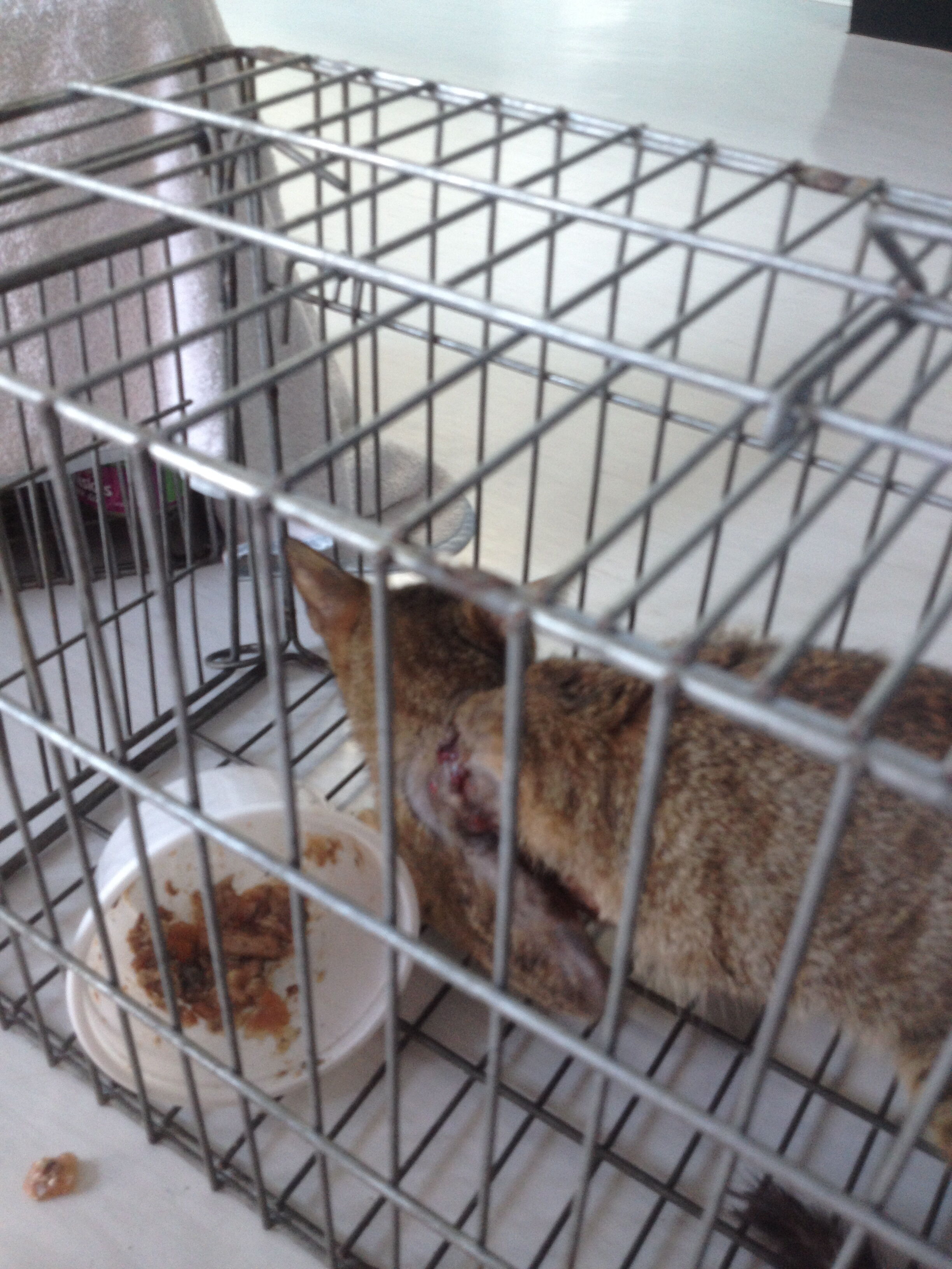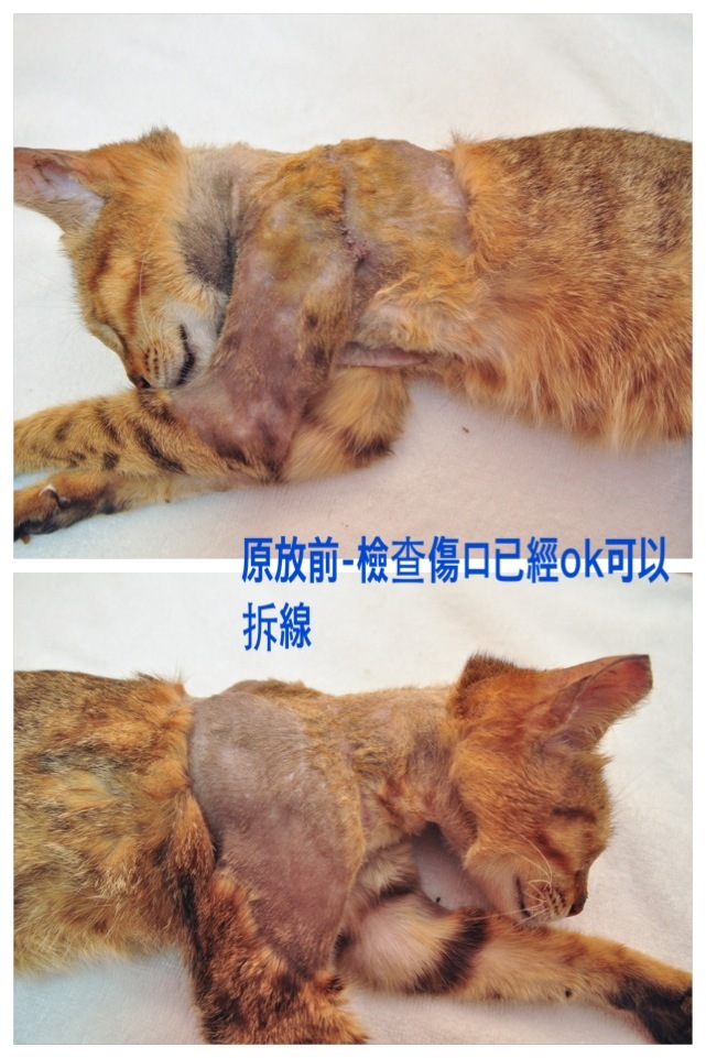 今天原以為只是單純的結紮,橡皮筋剪掉傷口清理就好了。 沒想到送去醫院檢查後,醫生說橡皮筋已經被肉包起來了,要把肉挖開才能清除橡皮筋,傷口有很長一段時間了!! 但是貓的情況不太好…手術從頭到尾牠都是失溫的狀態,血液也很稀!! 醫生建議要做基本的血液檢查,但這些費用已超出能力範圍。動物近況說明: 貓咪在經過頭三天的住院打點滴給藥之後,狀況比較穩定了,就帶回家關籠術後照顧。每三天帶去給醫生打抗生素還有檢查傷口。因為非常緊張又不親人,實在也覺得關著牠很可憐,但是醫生說傷口沒有完全收乾在拆線的話,放回去傷口一定會裂開只好繼續照顧。好不容易傷口終於好了在初一當天原放回牠居住的地點。一帶回去開籠子牠就衝出跳上牆頭跑掉了,很有活力。今天有看到牠出來吃飼料,還在地上磨蹭,感覺狀況還不錯,很感動!