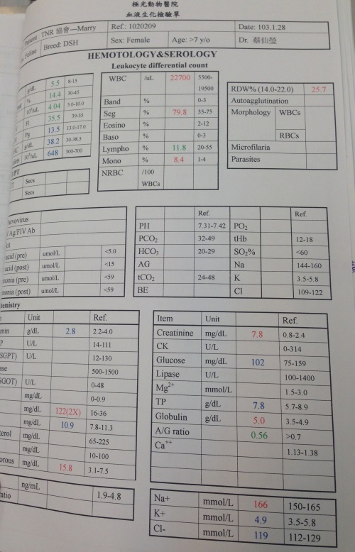主題: 側腹傷口 申請者姓名: 臺北市支持流浪貓絕育計劃協會 花色: 申請日期: 2014-02-12 19:39:38 申請者部落格: 申請者臉書網址: 所在縣市/合作醫院: 台北市/極光動物醫院 治療費用: 7155元 需求人數: 9人 已結案 (2014-03-24 18:13:14) 報名人員: ec0129(已付款)、心上人(已付款)、Nick Lin(已付款)、Shine(已付款)、lavinia x2(已付款)、Nico Ting、喜吱吱(已付款)、小四(已付款)、Even Chen(已付款)、 候補人員: 動物病情說明: 腎衰乳癌的天空,側腹出現一片硬硬的痂皮,邊緣有化膿的跡象,血檢白血球兩萬七千有感染的狀況,醫師檢查後先給予口服抗生素治療,第三天痂皮突然掉落,皮膚外露,正逢大年初一,緊急聯絡醫師,醫師建議塗優點軟膏,持續觀察傷口是否有感染的狀況,幾天過後傷口已經沒有白白的膿樣分泌物,但始終沒有縮小,天空又掙脫頭套,把側腹部傷口舔得出血,回診醫師建議若要讓傷口長的快,建議早晚更換人工皮,帶回照顧一周後傷口明顯縮小。