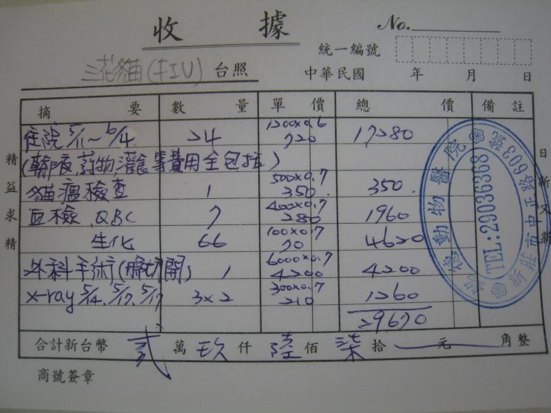 主題: 吃泥土維生的三花貓 申請者姓名: 臺北市支持流浪貓絕育計劃協會 花色: 申請日期: 2012-06-08 14:39:32 申請者部落格: 申請者臉書網址: 所在縣市/合作醫院: 新北市/銘德動物醫院 治療費用: 29670元 需求人數: 32人 已結案 (2012-12-01 19:35:39) 報名人員: 黃杋(已付款)、r(已付款)、Renee Wu(已付款)、juno(已付款)、Above Wang(已付款)、Huei-Huei Lin(已付款)、Gumei(已付款)、熊貓(已付款)、Eden Lin、Wang Wang Huang(已付款)、Carol Wang(已付款)、游妃妃(已付款)、weavery(已付款)、Wang Wang Huang、張良棋(已付款)、Eden Lin、terranliu(已付款)、Kylie Chen(已付款)、王馨(已付款)、Nonie Huang(已付款)、Liszt Huang(已付款)、OLivia Lee(已付款)、Liszt Huang(已付款)、Phoebe Lee(已付款)、Kristine Chuang(已付款)、無名氏(已付款)、Chia Min Chen(已付款)、Chia Min Chen(已付款)、Chia Min Chen(已付款)、cc(已付款)、林彥岑(已付款)、單人房(已付款)、樂、修(已付款)、Liszt Huang(已付款)、Lai Fhifhi(已付款)、 候補人員: Yumi、雲朵兒、 動物病情說明: 這是一位楊小姐在新莊某個大馬路分隔島上救援到的,