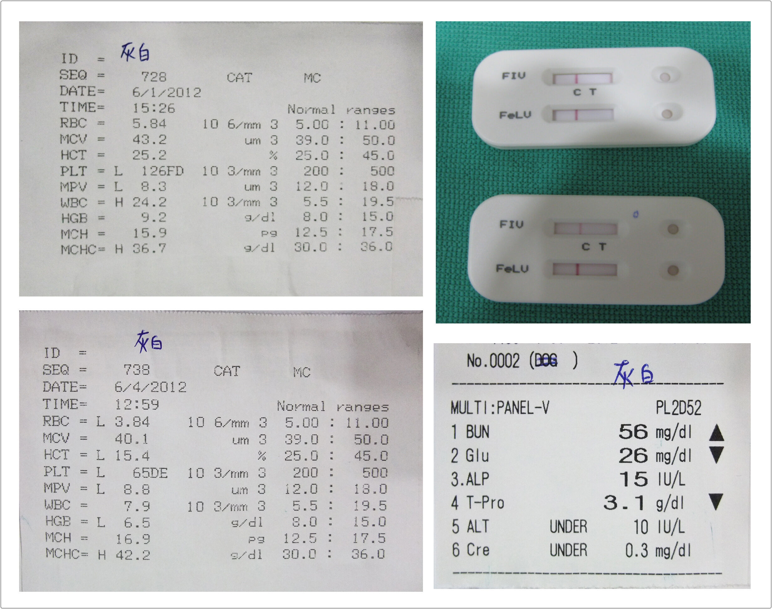 6月1日接到貓友拳四郎的電話,他說有2隻嘴巴潰爛的路倒貓要送去德民動物醫院,打電話給醫生預備急診後,隔天,我就到醫院探視這2隻貓咪。