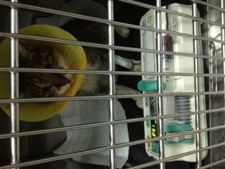 2�13晚間去醫院看大頭,今天都沒吃且乾嘔,護士姐姐幫他把頭套拆掉舒服一點,終於哄他吃了幾口我帶去的老貓湯包,今天精神差了點,護士說這兩天會再做一次血檢!