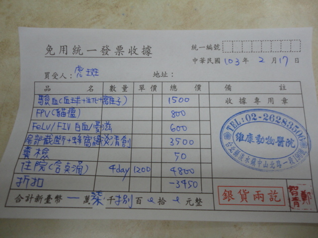 主題: 收容所出來,結紮後尾巴+趾縫組織壞死,4天後得貓瘟 申請者姓名: 張胖子 花色: 申請日期: 2014-03-10 16:23:56 申請者部落格: 申請者臉書網址: 所在縣市/合作醫院: 新北市/維康動物醫院 治療費用: 7800元 需求人數: 18人 已結案 (2014-05-18 09:40:18) 報名人員: 妮妮(已付款)、Tetsu x2(已付款)、Amber Chung x2(已付款)、Michelle Lin(已付款)、Becca Huang x2(已付款)、Yuan-Hsin Kuo(已付款)、JasmineC x2(已付款)、Jasmine Lin(已付款)、楊政遠 x2(已付款)、游小依 x2(已付款)、小四 x2(已付款)、 候補人員: 動物病情說明: 103/02/07五股收容所出來