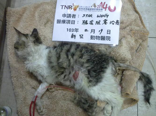 主題: 竹南收容所腸道阻塞貓 申請者姓名: Star Wang 花色: 申請日期: 2014-03-05 00:51:56 申請者部落格: 申請者臉書網址: 所在縣市/合作醫院: 新竹市/新竺動物醫院 治療費用: 13500元 需求人數: 16人 已結案 (2014-03-24 18:12:06) 報名人員: 郭銘賢(已付款)、張納豆(已付款)、Pei Yin(已付款)、保齡球(已付款)、丰(已付款)、謝雨妡 x2(已付款)、Qu Een x2(已付款)、Verde Claro x2(已付款)、林小豬 x3(已付款)、chiawei(已付款)、小古(已付款)、 候補人員: 動物病情說明: 竹南收容所2/19接出的小朋友,