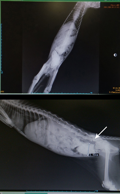 醫師觸診摸到腹部有硬塊,後腿骨頭不太正常,