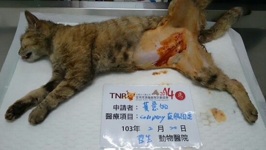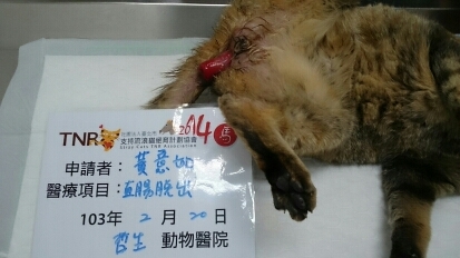 主題: 直腸脫出哀哀叫的虎斑母貓 申請者姓名: 黃意如 花色: 申請日期: 2014-03-07 19:21:57 申請者部落格: 申請者臉書網址: 所在縣市/合作醫院: 新北市/哲生動物醫院 治療費用: 8080元 需求人數: 9人 已結案 (2014-03-24 18:12:02) 報名人員: Diana Chang(已付款)、sandroio(已付款)、Andy Chun(已付款)、陳怡君(已付款)、Jason Chang(已付款)、周先媛(已付款)、susan(已付款)、Michelle Lin(已付款)、Rebecca(已付款)、 候補人員: 動物病情說明: 關渡宮前美食區餵養的浪貓,上週五放飯時發現肛門處一截血紅色的腸子跑出來,連最愛的罐罐都不吃,疼痛哀哀叫。因疼痛戒心很重,經多次誘捕不成,守候至天黑,決定第二天再繼續,後來幾天寒流來襲,擔心腸子壞死,持續守候。終於7天後出現,順利誘