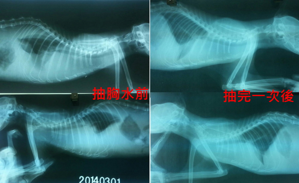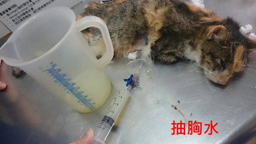 深三花在收容所染上嚴重鼻氣管炎,眼膿鼻塞不肯進食,送醫後貓瘟檢驗陰性,體溫只有37.5度偏低,精神很差,脫水嚴重,上點滴後有比較舒服一點,早晚噴霧治療灌食、保溫、上點滴、給與泡疹病毒專用的藥物,希望可以幫助她恢復體力,兩周後貓咪突然出現胸水,變得非常不舒服,照x光確認後,抽胸水,狀況很不樂觀,最後還是當了小天使,收容所這個毒窟真的很可怕,貓咪進去就會感染疾病,難逃一死...