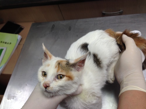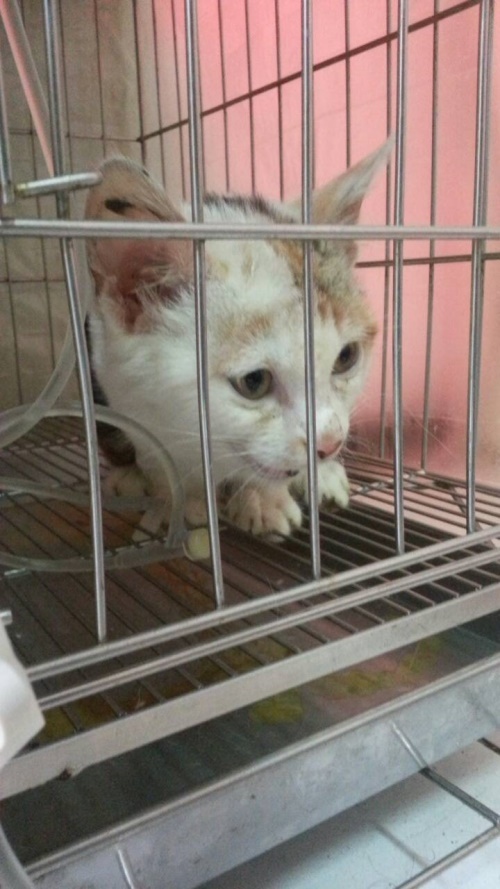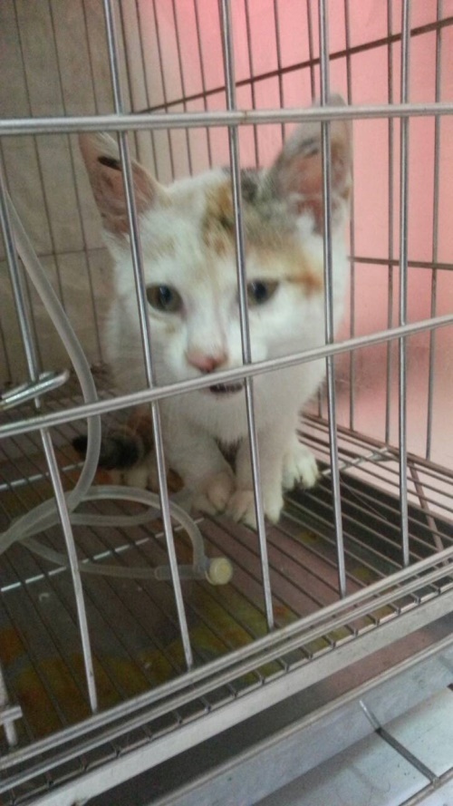 小三花有嚴重鼻氣管炎的現象,眼膿鼻塞不肯進食,醫師灌食好幾天,本來狀況一度好轉,確次某次灌食後嘔吐,精神開始又變差,懷疑可能是感染貓瘟,因第一家醫院還有數隻收容出來住院觀察的貓咪,避免群聚感染,先轉院檢驗、治療,到院檢查體溫略高,貓瘟試劑檢驗陽性,上點滴希望能夠幫助她耐過貓瘟,晚上開始劇烈嘔吐,腹瀉,狀況十分糟糕,最後沒能熬過,當了小天使。