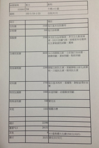 主題: 圓仔一家五口住院 申請者姓名: 臺北市支持流浪貓絕育計劃協會 花色: 申請日期: 2014-03-14 18:25:02 申請者部落格: 申請者臉書網址: 所在縣市/合作醫院: 台北市/極光動物醫院 治療費用: 21650元 需求人數: 23人 已結案 (2014-03-24 18:11:34) 報名人員: ERic YU(已付款)、Mandy Yeh(已付款)、Vicky(已付款)、Daniel Tsai(已付款)、Ch Huang(已付款)、Claire Huang(已付款)、paula chen x4(已付款)、ONE(已付款)、Yupei Hsu(已付款)、00(已付款)、mee(已付款)、lofxbaytu(已付款)、小黃(已付款)、Sunny Chen(已付款)、Ou Han x2(已付款)、Shi Jie Chen(已付款)、Chris Chen(已付款)、Andrea Ouli x2(已付款)、 候補人員: 動物病情說明: 這筆費用為一月19日-1月23日圓仔一家五口住院費用申請,