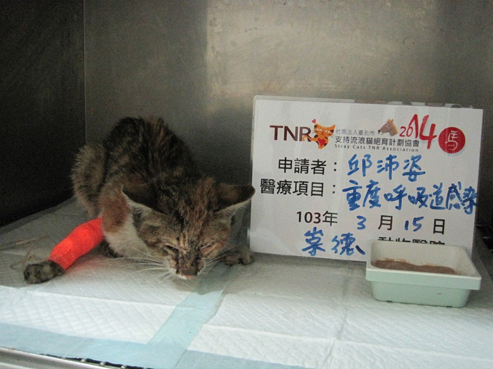 主題: 重度呼吸道感染的小花貓 申請者姓名: 邱沛姿 花色: 申請日期: 2014-03-31 14:17:52 申請者部落格: 申請者臉書網址: 所在縣市/合作醫院: 台中市/崇德動物醫院 治療費用: 10000元 需求人數: 12人 已結案 (2014-06-20 16:28:16) 報名人員: luna_lin(已付款)、Rakura Lo(已付款)、Naima(已付款)、WeiLin Chen x2(已付款)、Winnie Chen(已付款)、Shizuka Ho(已付款)、Candice Chao(已付款)、愛梨(已付款)、龔美凌(已付款)、裘爸(已付款)、Cheza Joan eddy(已付款)、 候補人員: 動物病情說明: 昨天(3/15)中午,提著一隻要結紮的浪貓走去公車站牌的路上,經過一個小菜園,驚見一隻兩個月大的小花貓趴在車子旁邊,原本以為小花貓已經死掉了,想說要裝到隨身攜帶的購物袋裡面一起帶去醫院,結果一拎起來,小貓小掙扎了一下,還有著微弱的呼吸,當下真的嚇到我了!不管牠身體多髒或是否有跳蚤,快點塞進穿在身上的外套裡面用自己的體溫讓牠別失溫!!飛奔似的跑去搭公車並打電話跟醫生說拜託休息時間一定要等我過去,小貓快不行了!到醫院後確定是重度呼吸道感染,又加上小貓已經嚴重脫水,所以快點上點滴治療!因為我中途太多貓了,薪水只有一萬多,根本無力負擔這麼大筆的開銷,拜託協會幫忙了>< 動物近況說明: 3/19去探望小花貓時精神狀況還不錯!而且還吃乾乾給我看~邊吃邊撒嬌!!