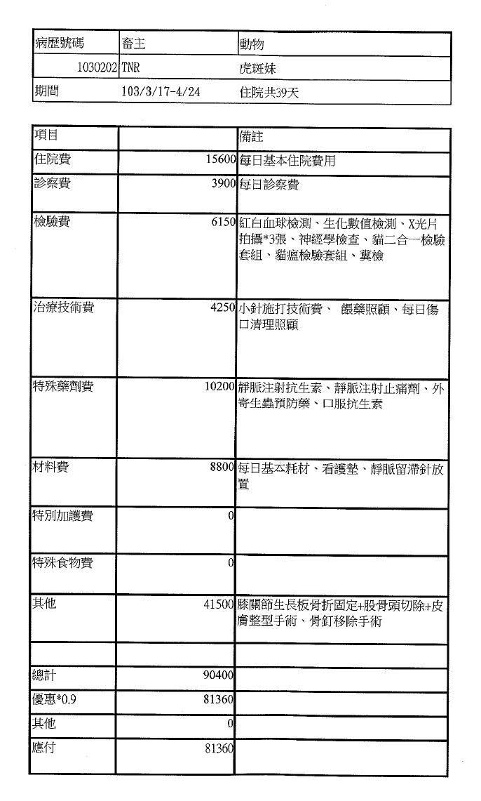 虎斑妹的醫療費共81,360元,懇請協會允准申請醫助,並懇請大家幫忙。