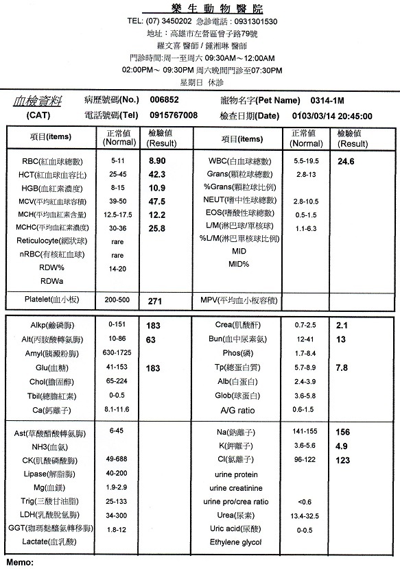 1:醫生說驗血是因為貓咪尾巴感染要手術所以要先知道他身體狀況及感染狀況,及是否有其他疾病,知道貓咪是否能立即手術