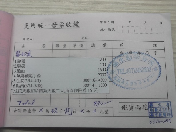 4:壯壯住院期間我一共有去看過他三次,一次在手術後的隔天,他當天麻醉後醒沒什麼食慾,所以當天有使用點滴替他補充營養,第二次是上班期間中途請假去看,醫生說他進食方面都正常,他精神狀況很好,傷口癒合狀況比較慢一些,第三次在三月底,到院確認壯壯的傷口癒合狀況,醫生說在幾天就能出院了,當天也有看一下他的傷口,及詢問醫生他的狀況,一切都還正常