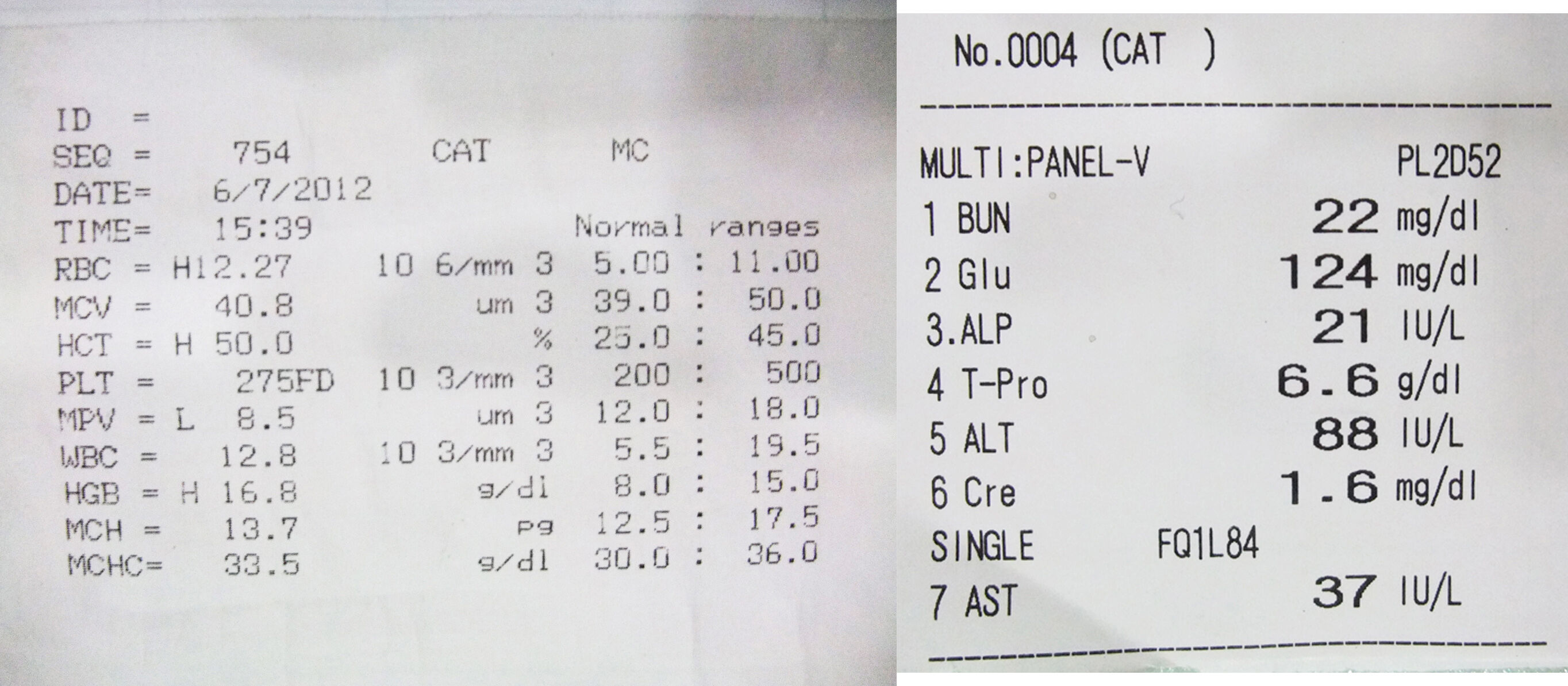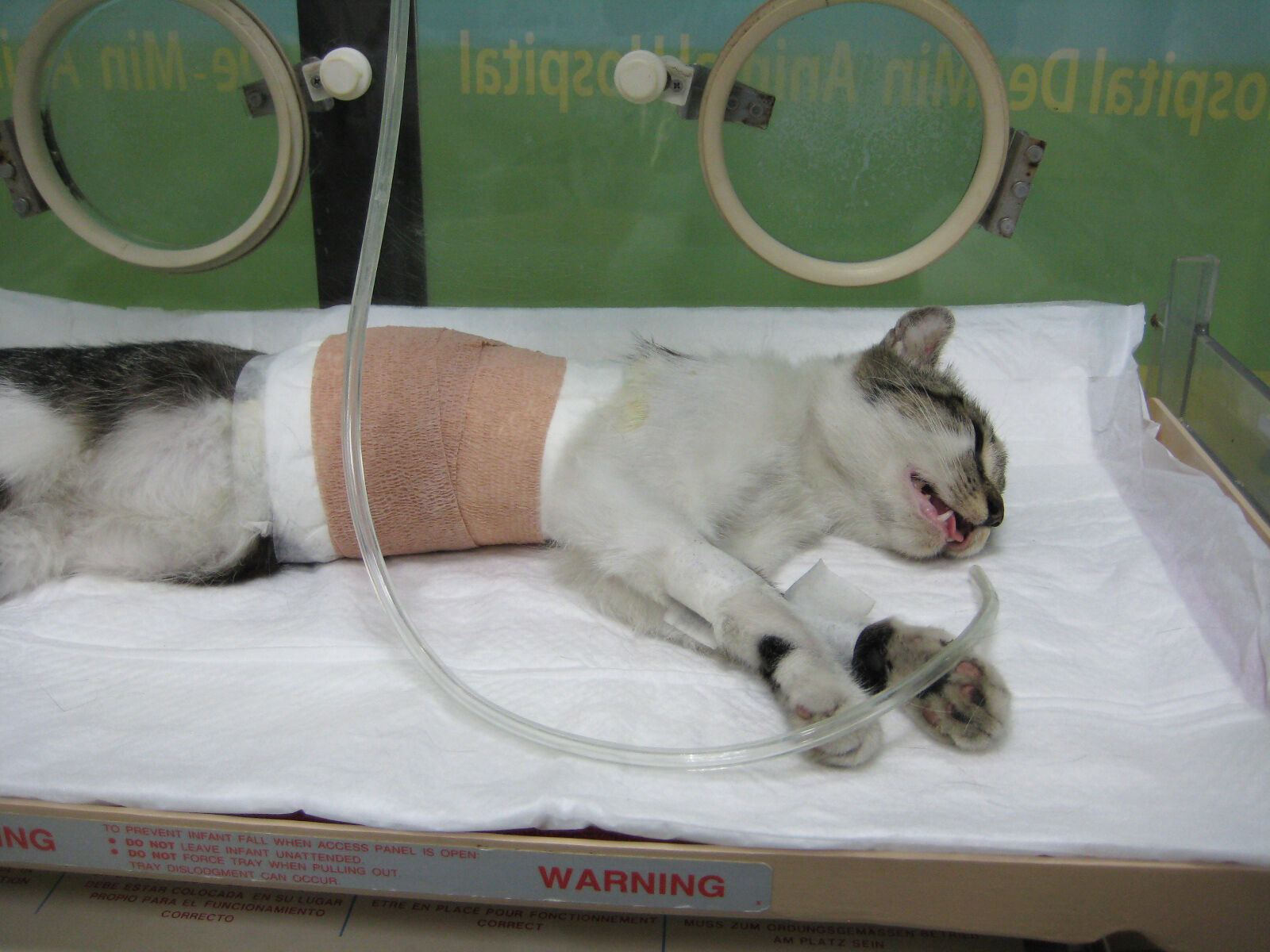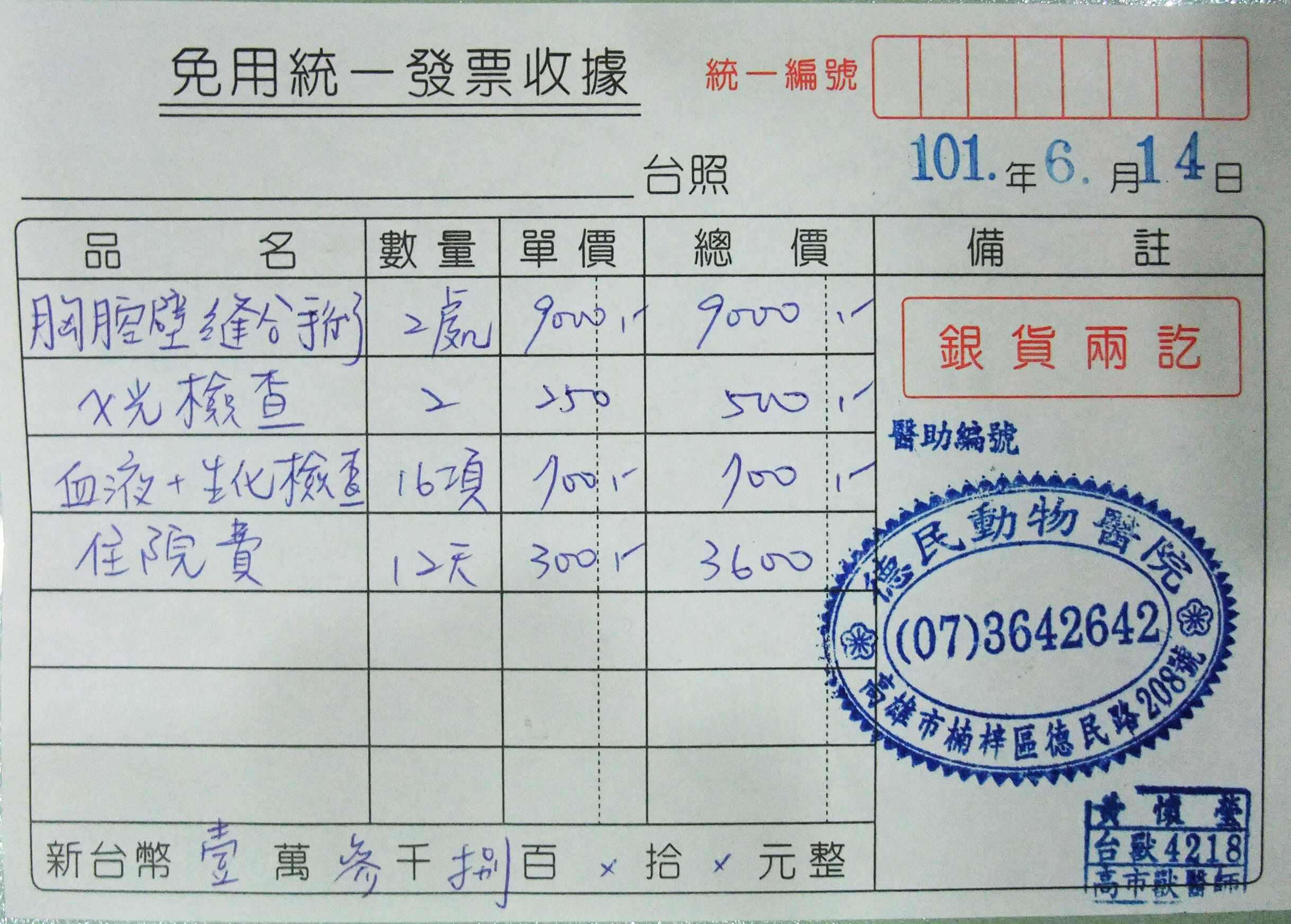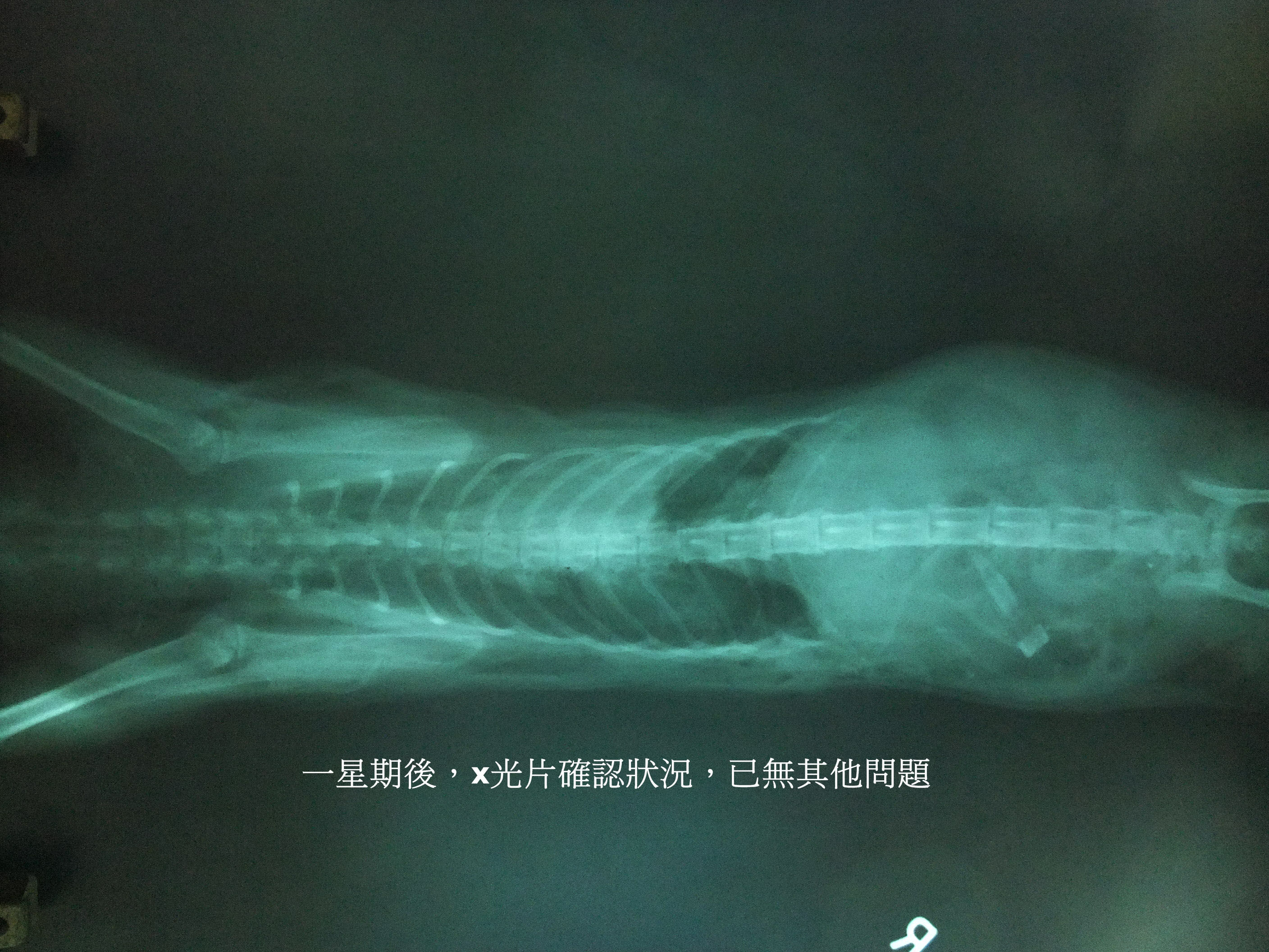 醫生的X光片顯示,第十二根肋骨斷裂並產生氣胸,馬上緊急手術。因發現的早,所以貓咪很幸運的撿回一條命。