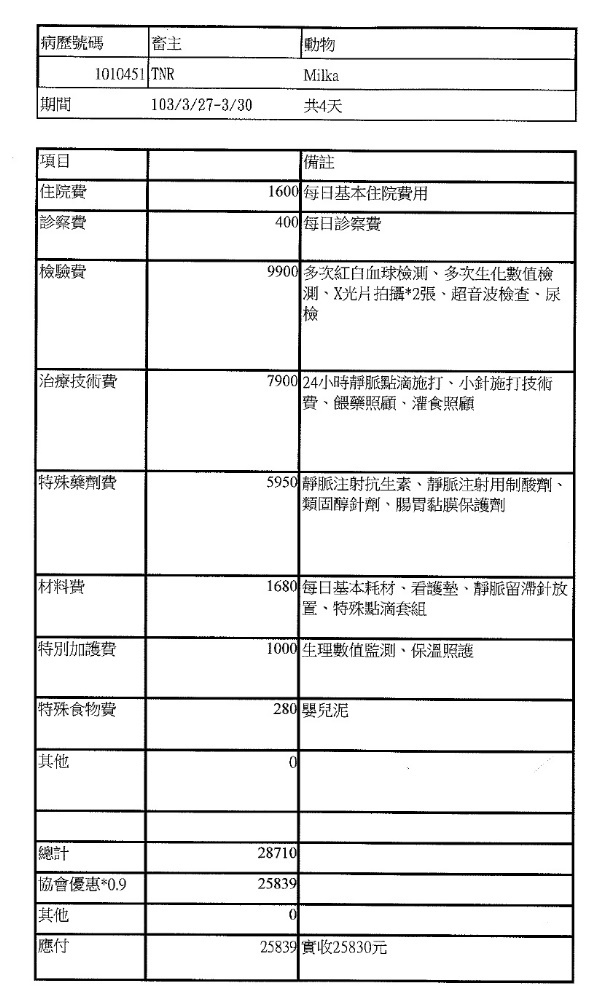 這次就醫Milka 已不吃不喝,眼神不如以往,我知道她時間已到,今天探望她,還可以撫摸她,只希望在最後的日子裡,她的身體不需承受太大苦楚,晚間十點半接獲醫師電話,Milka完成一生功課畢業了...