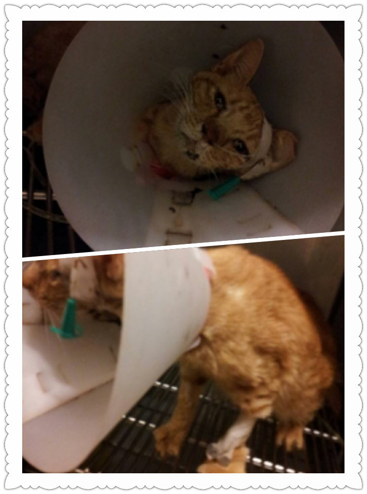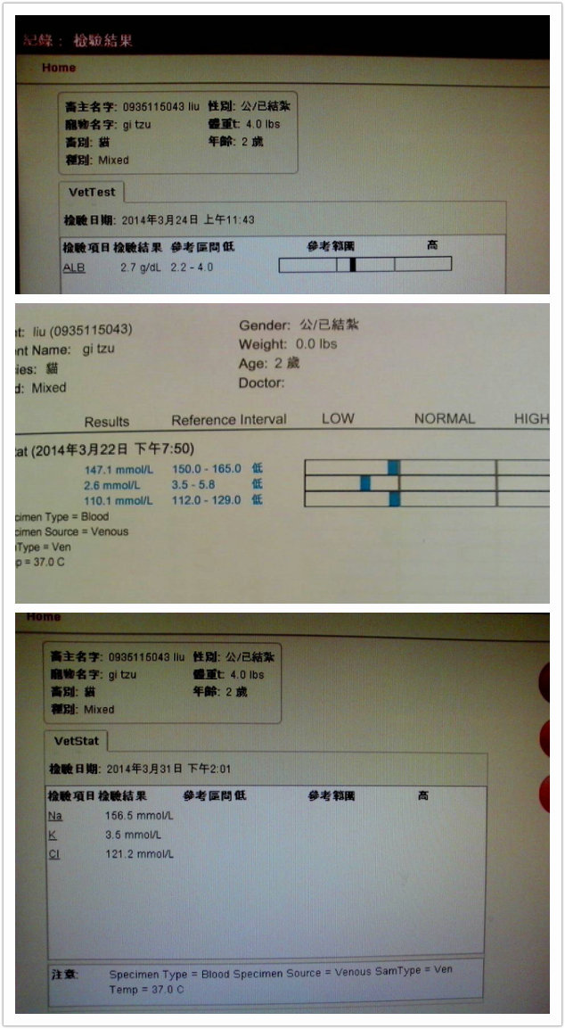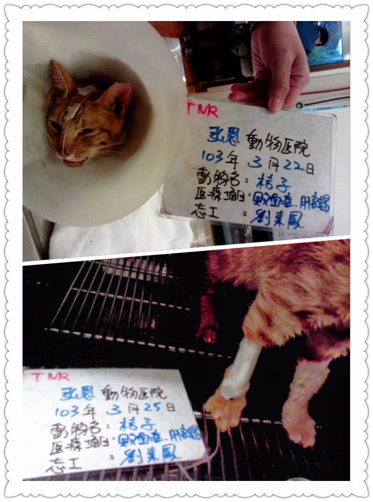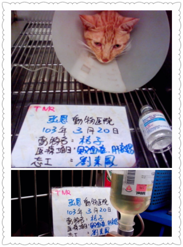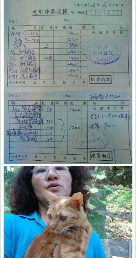 主題: 鼓山台電親人不吃發燒橘貓 申請者姓名: 劉素鳳 花色: 申請日期: 2014-04-11 23:17:13 申請者部落格: 申請者臉書網址: 所在縣市/合作醫院: 高雄市/弘恩動物醫院 治療費用: 9000元 需求人數: 11人 已結案 (2014-05-18 09:43:56) 報名人員: Jessica C. Chang x2(已付款)、Michael Chang(已付款)、naifulei x8(已付款)、 候補人員: 動物病情說明: 這是餵食區鼓山台電旁,一隻親人的橘子貓,好幾天不吃沒精神,帶到院檢查有發燒,醫師診斷血檢已敗血症 肝衰竭,感謝醫院緊急搶救他,第一天醫生也說不樂觀,我哭著求醫生救救牠,也已向牠告別了,請貓咪真的不行了就安心去吧,醫生在第一天幫貓咪打了白蛋白,後來裝鼻胃管, 也出動了兩台點滴點幫浦同時使用 一台靜脈注 一台經鼻胃管灌食,努力並給予最好的醫療, 醫生這樣承諾會盡力救他, 臉書上大家都幫忙集氣要貓咪加油, 總於貓咪慢慢好轉並會自己進食了,這隻原本在收容所即將被安樂的貓, 在協會協會專案結紮離開收容所後,他待在了我的餵食區,非常親人,也因為這樣我才能注意到他生病怪怪的, 這次從死神身邊救回後,我把他留在我身邊了,不要讓他在外面受苦,我要讓他好好的過完他的一生, 謝謝大家的捐款協助