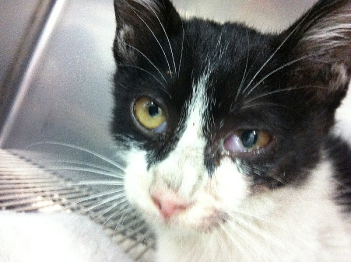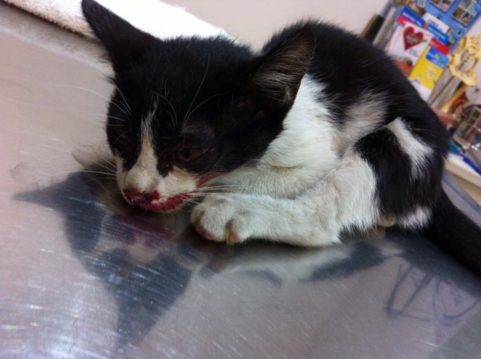 小貓鼻腔流血且瞳孔大小不一,