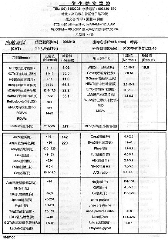 貓咪4/10做了血檢雖肝指數仍有上升但發炎狀況已有改善且出血狀況已回穩,紅血球有上升的趨勢,