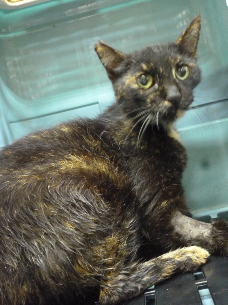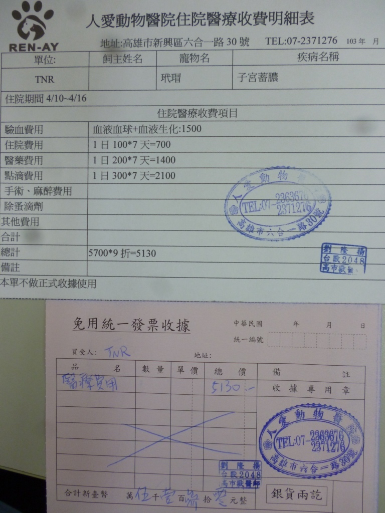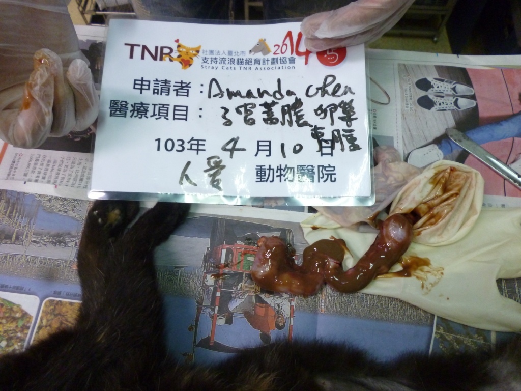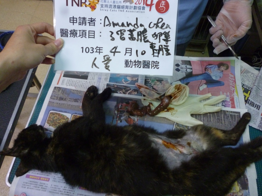 主題: 肚子大大子宮蓄膿的母貓 申請者姓名: Amanda Chen 花色: 申請日期: 2014-04-17 21:08:29 申請者部落格: 申請者臉書網址: 所在縣市/合作醫院: 高雄市/人愛動物醫院 治療費用: 5130元 需求人數: 6人 已結案 (2014-05-18 09:43:03) 報名人員: 林愛美(已付款)、Rita Cho(已付款)、Yun Shan x2(已付款)、Maruko Hung(已付款)、Shan Shi Lai(已付款)、 候補人員: 動物病情說明: 4/10一大早去到餵養區進行TNR作業.看到一隻平常較少出現的玳瑁母貓.看她肚子大大的.我以為不是懷孕??還是哺乳??太遠了看不清楚.終於捕到他時.由於牠有吃到食物.黃昏在送至醫院進行TNR作業.晚上醫院進行手術.發現他有嚴重子宮蓄膿及巧克力囊腫.ㄚ貴年紀有點大.擔心她肝腎有受到傷害.醫生建議生化檢查及輸液治療。ㄚ貴血檢肝腎及血糖指數異常.子宮蓄膿的貓會影響肝腎.再晚一部治療ㄚ貴就要去當小天使了.所以幫街貓結紮是很重要的. 動物近況說明: 不知經歷了多少苦難的夜晚.一輩子第一次住院.ㄚ貴顯的很不習慣.或許ㄚ貴在想念他的家.他的同伴.4/16終於療程結束.下班後把ㄚ貴送回他的(家).流浪貓哪有家呢??打開運輸籠ㄚ貴快步離去.在遠去牠停下來回眸望了我ㄧ眼.駐足一直凝視著我.彷彿在跟我們說:謝謝你們醫治了我.讓我肚子不在痛痛.痛苦的去當小天使.就讓ㄚ貴在牠熟悉的環境安享晚年吧!