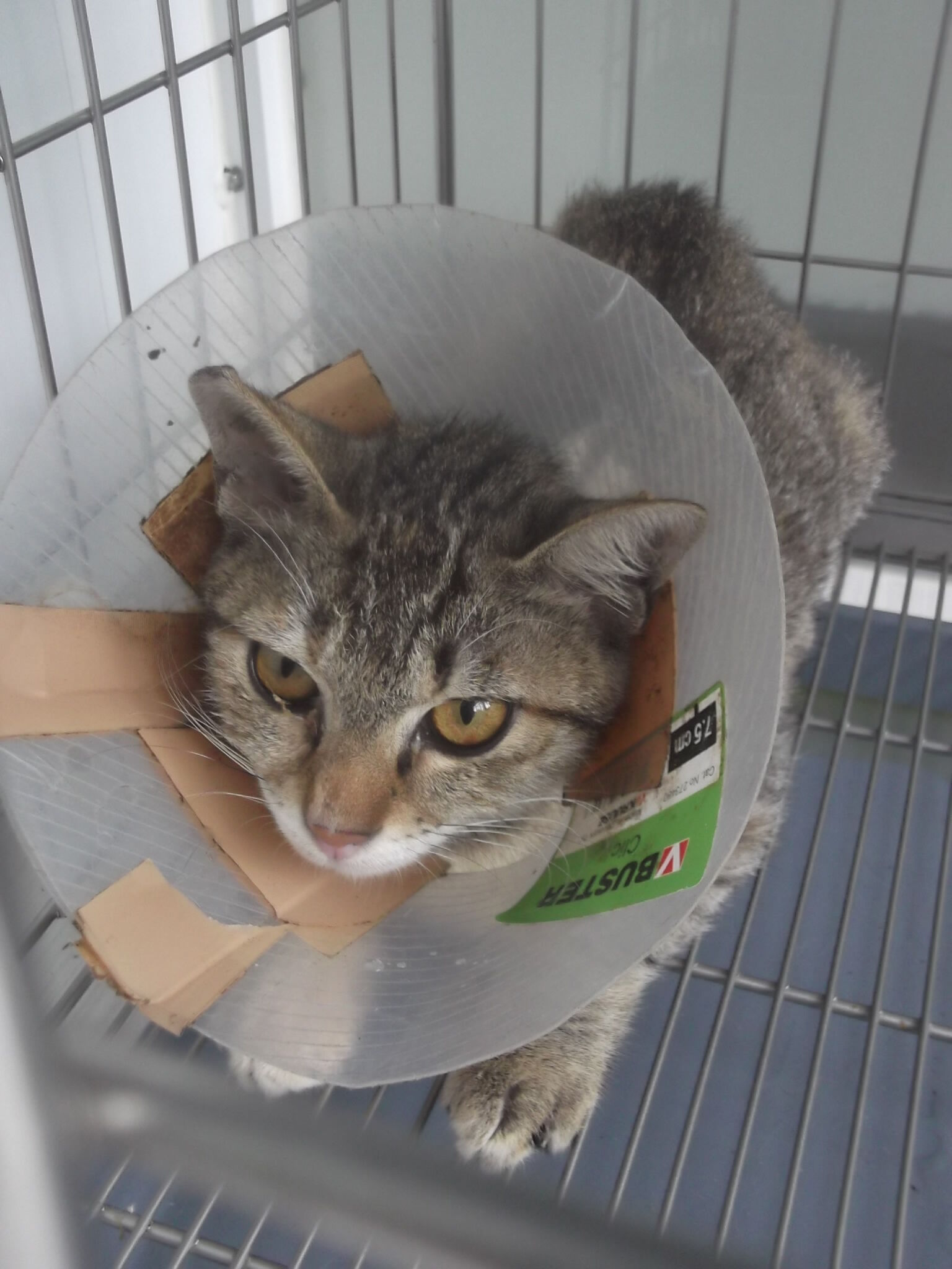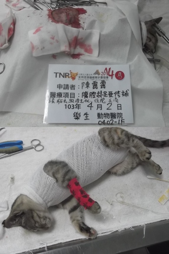 主題: 內腹部破洞腸子沾黏之大眼妹 申請者姓名: 陳露露 花色: 申請日期: 2014-04-19 06:59:37 申請者部落格: 申請者臉書網址: 所在縣市/合作醫院: 高雄市/樂生動物醫院 治療費用: 6000元 需求人數: 7人 已結案 (2014-05-18 09:42:48) 報名人員: 小四 x2(已付款)、Drew 酷朱(已付款)、Evan Chung、大聲說(已付款)、大聲說(已付款)、大聲說(已付款)、捲捲米花(已付款)、 候補人員: 動物病情說明: 志工餵養區域在寒冬時來了一隻新貓