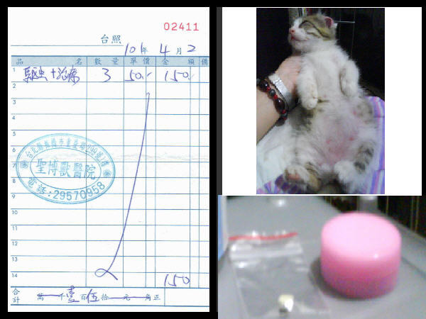 3隻貓驅蟲、嘿嘿-皮膚藥膏、喜喜打疥癬針(04/06吃驅蟲藥)