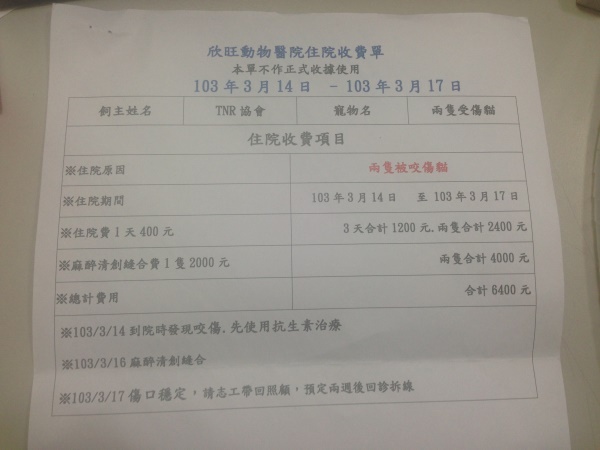 兩隻貓咪手術清創、住院、抗生素治療、拆線共6400元