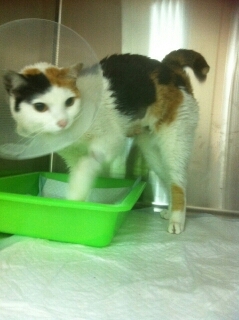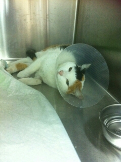很擔心美眉的傷勢而到處尋找卻無所獲,幾天後美眉才回到餵食點,那時牠已消瘦許多,後半身歪斜凹陷,且出現呼吸急促的現象,研判可能因被車子撞擊已造成疝氣,恐有生命危險,乃於4/12救援,並請協會醫助,非常感激協會安排貓咪美眉送到極光動物醫院。