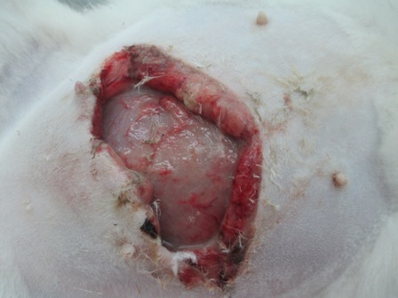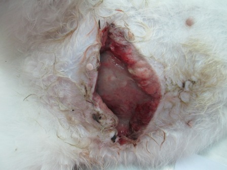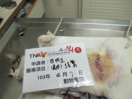 主題: 疑似清明被割草砍傷的母貓 申請者姓名: Doc Tian 花色: 申請日期: 2014-04-23 17:49:51 申請者部落格: 申請者臉書網址: 所在縣市/合作醫院: 台北市/欣旺動物醫院 治療費用: 10100元 需求人數: 12人 已結案 (2014-06-20 16:30:02) 報名人員: cigdemchen(已付款)、柚子媽(已付款)、羅曉筑(已付款)、小四(已付款)、Doc Tian(已付款)、曹小文 x2(已付款)、Amberger(已付款)、Ronnie Tseng(已付款)、wgs(已付款)、小四 x2(已付款)、 候補人員: 動物病情說明: 平常每天都在後陽台出現的阿菊,一如往常地出現,但這次突發現下腹部有血跡,仔細查看居然露出一大塊皮下組織,像是被利刃割傷,立即跟其他貓媽媽借貓籠來誘捕,來到獸醫院時連護士都嚇一大跳,非常幸運地沒有傷及內臟,進行縫合邊進行結紮,住院後恢復情狀良好