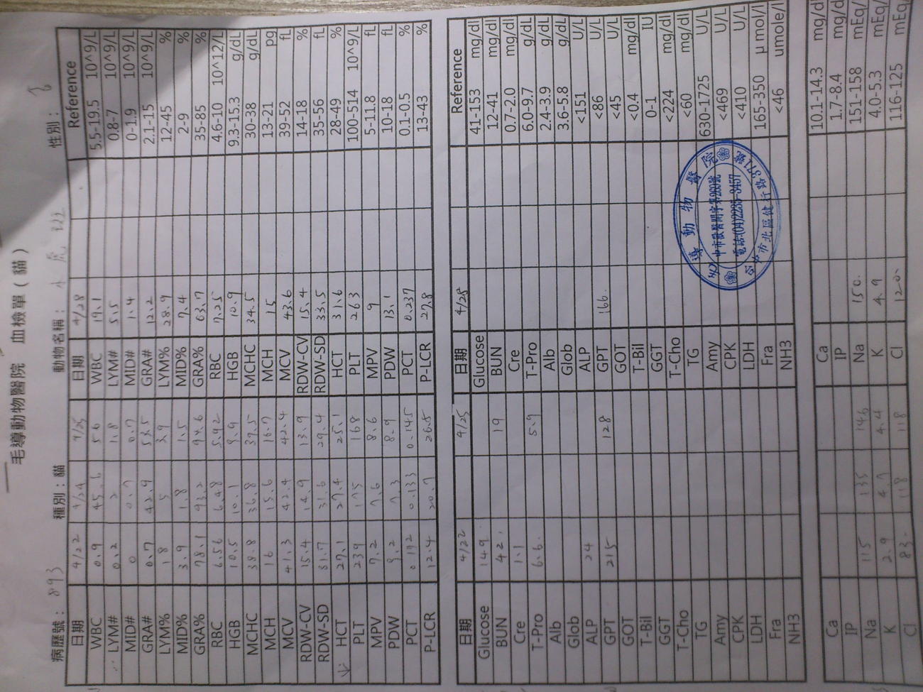 4/24 早上去看他,有吃一點罐頭,精神不錯,會朝我揮爪子了。下午血檢白血球升到四萬七(超高) 算是過了病毒關 進入二次感染時期 開始用抗生素控制。