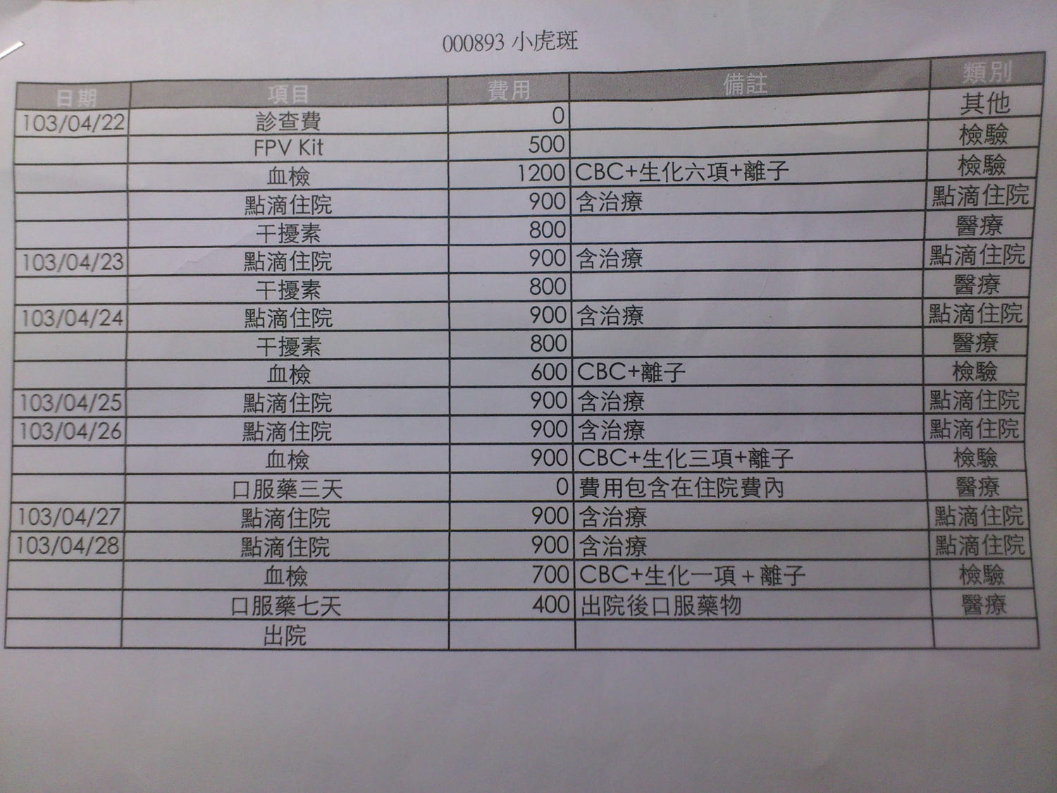 主題: 脫水嚴重的貓瘟虎斑浪浪 申請者姓名: 林芳瑜 花色: 申請日期: 2014-04-30 23:54:14 申請者部落格: 申請者臉書網址: 所在縣市/合作醫院: 台中市/毛導動物醫院 治療費用: 13000元 需求人數: 15人 已結案 (2014-06-20 16:29:59) 報名人員: Jackie Kang(已付款)、Funky(已付款)、Andrea Lin(已付款)、Maureen Huang(已付款)、波波(已付款)、劉玉婷(已付款)、Ultima Xiao(已付款)、張阿陸(已付款)、chiawei(已付款)、吳小海(已付款)、Gina Pan(已付款)、山豬小孩(已付款)、阿屁 x2(已付款)、shuku(已付款)、 候補人員: 動物病情說明: 平常餵養的虎斑浪浪最近兩天都不過來吃,今早一看發現他脫水的很厲害,趕緊抓到最近的醫院檢查,發現是貓瘟,白血球只剩900,情況嚴重需要立即住院治療。 動物近況說明: 4/22 剛入院,貓瘟陽性,嚴重脫水,各項數值都很差,白血球只剩900