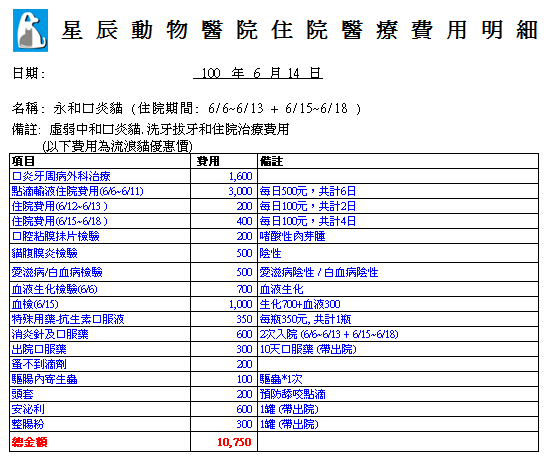 主題: 極度營養不良併腹瀉、口炎、白內障青光眼老浪貓 申請者姓名: 張嘉盈 花色: 申請日期: 2012-06-19 15:57:02 申請者部落格: https://www.facebook.com/media/set/?set=a.448743578471650.108410.100000080346180&type=1&l=6fb73eaa02 申請者臉書網址: https://www.facebook.com/media/set/?set=a.448743578471650.108410.100000080346180&type=1&l=6fb73eaa02 所在縣市/合作醫院: 台北市/星辰動物醫院 治療費用: 11000元 需求人數: 24人 已結案 (2012-12-01 20:08:17) 報名人員: Jill S.(已付款)、Llisalin(已付款)、林小咪(已付款)、Chunyao Chao(已付款)、林小咪(已付款)、Jeane Tuan(已付款)、Ting Chu(已付款)、賴珮君(已付款)、Jessica I-Chin Pan(已付款)、阮驛琇(已付款)、Chi-wei Hsu(已付款)、Chenyu Chang(已付款)、Vincent Hung(已付款)、王踢娜(已付款)、王踢娜(已付款)、沙粒小貓(已付款)、沙粒小貓(已付款)、沙粒小貓(已付款)、沙粒小貓(已付款)、沙粒小貓(已付款)、沙粒小貓(已付款)、沙粒小貓(已付款)、沙粒小貓(已付款)、沙粒小貓(已付款)、 候補人員: 小舟、 動物病情說明: 一處蒼蠅滿飛、垃圾滿堆,很恐怖的地方,有隻極瘦站不太穩的貓一直看著人類,等待食物,牠約10歲,雙眼白內障,左眼青光眼(瞳孔對光照無反應,已無功能),清晰見骨的背脊,骨瘦如材只剩2.3公斤,有牙齦炎及口炎的情形,後面臼齒搖搖欲墜,後面臼齒已拔,腹瀉嚴重,住院期間(6/6-6/13)喝多吃多尿多,打營養劑、腹瀉也已控制,口腔抹片檢驗為酸性肉芽腫(非漿細胞口炎),是營養不良所致,血檢:無愛滋病、白血病、腹膜炎,6/14出院當晚又狂腹瀉,且大目仔很會喝水,一次約喝200cc,尿尿有泡沫,6/15再次住院,2度血檢、尿液檢查,無糖尿病無蛋白尿,最大的問題還是營養不良、腸胃敏感,需要多多補充營養即可,大目仔很愛罐頭喔~