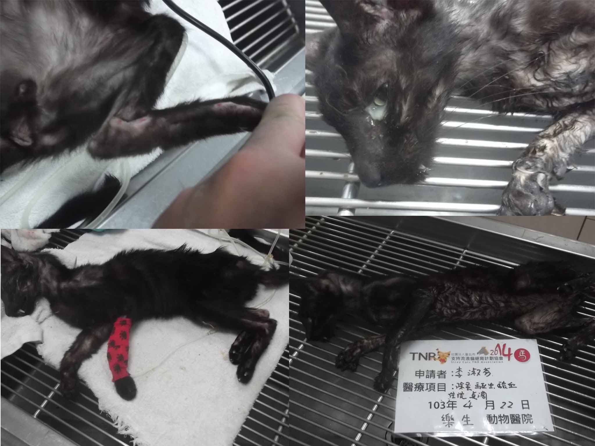 主題: 瘦如材骨的瓜子臉 申請者姓名: 李淑芬 花色: 申請日期: 2014-06-01 21:01:14 申請者部落格: 申請者臉書網址: 所在縣市/合作醫院: 高雄市/樂生動物醫院 治療費用: 21400元 需求人數: 24人 已結案 (2014-08-05 11:03:59) 報名人員: 啊駿(已付款)、Mia Chao(已付款)、小黃(已付款)、s.h.chen(已付款)、Norman Wu(已付款)、余蛋娘(已付款)、Wendy(已付款)、Patrick x6(已付款)、Nick Lin(已付款)、廖千慧(已付款)、irenesmile(已付款)、Jean Lin、beforn(已付款)、Ryan Ke(已付款)、Hanna Hsieh(已付款)、櫻花妹(已付款)、牡羊先生 x3(已付款)、Zoe Lin(已付款)、 候補人員: 動物病情說明: 4月22日凌晨四點多我餵食到最後第二站,當天預計要抓貓做結紮,正當我開始在準備工具時,遠遠的從巷子頭看到一隻貓用幾乎拖行的方式很緩慢的走過來,心想牠是誰!毛孩子都到齊準備開飯了,牠是新貓嗎?走近一看,倒吸了一口氣,牠瘦的可以清楚的看見肋骨和脊椎,身上的毛稀疏的誇張,眼睛周圍還有濃濃的分泌物,餵養浪貓那麼多年,還是第一次看到那麼瘦的浪貓,這隻貓到底是怎麼了?從哪來?心裡滿滿的問號,於是更改了計畫,決定抓他去看醫生,看著牠行動很緩慢,心想用手提籠試試,拿出準備好的罐頭加鮭魚塊,擺到牠面前,媽呀!牠狂嗑!頭也沒抬起來過,看來牠很餓,於是我用半抱半夾住牠的方式將他慢慢的塞進提籠裡,這過程也耗了一個小時,一大早跟公司請了假,快速的送她去樂生動物醫院