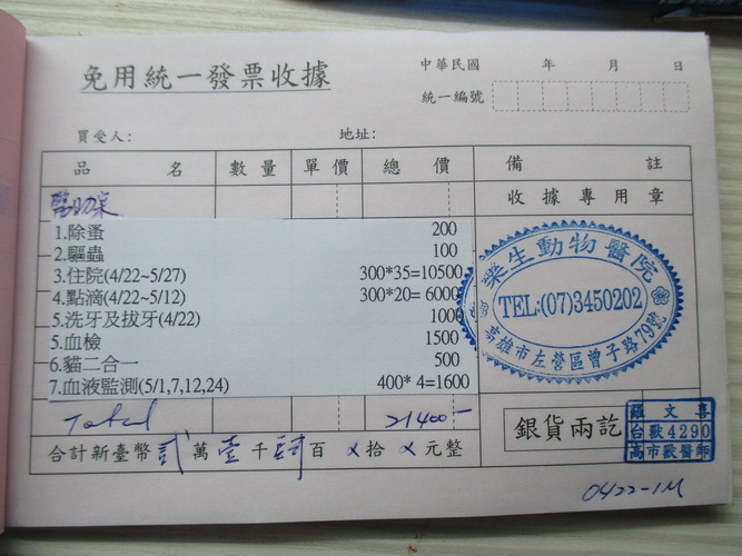 4/22 醫生當天檢查發現他有嚴重口炎,須拔牙跟洗牙
